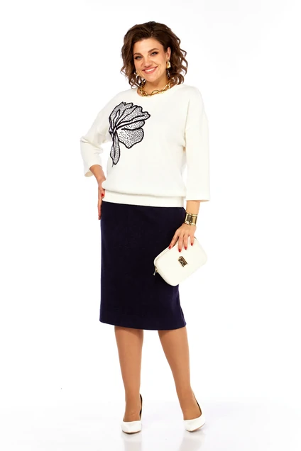 Этот модный, теплый, мягкий трикотажный комплект, подарит Вам тепло и уют. Удобный джемпер прямого силуэта со спущенным плечом. Перед без нагрудных вытачек, с правой стороны переда расположена дизайнерская вышивка в виде цветка. Спинка без среднего шва. Горловина обработана бейкой. Рукава ¾. По низу изделия пояс.