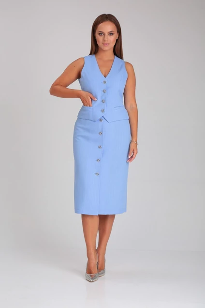 Комплект женский,состоит из жилета и юбки.Юбка прямого силуэта из костюмной ткани.По переду застежка на шесть петель и пуговиц.По переду и спинке вытачки.Жилет женский на подкладке,с центральной застежкой на четыре петель и пуговиц(размер и цвет фурнитуры может незначительно отличаться от фото)прилегающего силуэта.Перед жилетки с рельефными швами идущими от проймы до низа изделия.Карманы по переду прорезные в простую рамку с листочкой.Низ борта скошенный.Спинка жилета со средним швом и рельефными швами идущими от проймы до низа изделия.Горловина без воротника с V-образным вырезом.Костюм подойдет для повседневной носки,а также для официальных мероприятий.Он сочетается с различными акскссуарами и обувью.Рост модели 170см.Длина жилета по спинке 49см,Длина юбки 74см.