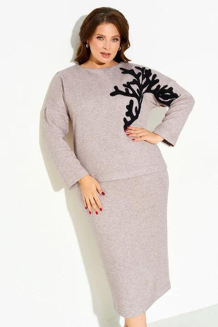 Костюм женский, состоящий из джемпера и юбки. Джемпер полуприлегающего силуэта из мягкого трикотажного полотна с добавлением ангоры со втачными немного спущенными рукавами и округлым вырезом горловины. По переду дизайнерская вышивка. Юбка полуприлегающего силуэта, зауженная книзу, на эластичной подкладке с притачным поясом на резинке; по спинке шлица. Рекомендована бережная стирка при t 30; глажение при максимальной температуре прессующей поверхности утюга не более 110 С.