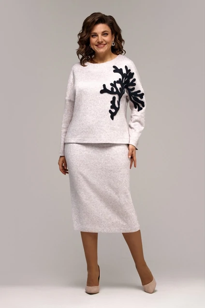 Костюм, состоящий из джемпера и юбки. Изделие выполнено из мягкого трикотажного полотна с добавлением ангоры. Джемпер полуприлегающего силуэта, рукава спущены, вырез горловины округлой формы. Джемпер дополнен дизайнерской вышивкой. Юбка полуприлегающего силуэта, зауженная книзу. В нижней части среднего шва заднего полотнища юбки - шлица. Пояс на эластичной тесьме. Рекомендована бережная стирка при t 30; глажение при максимальной температуре прессующей поверхности утюга не более 110 С.