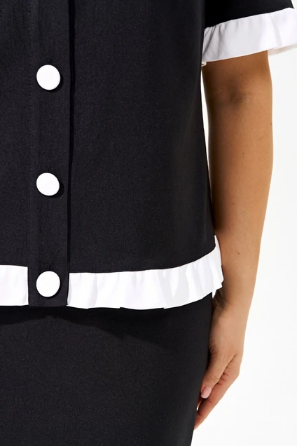 Костюм женский полуприлегающего силуэта выполнен из облегченной костюмной ткани с небольшим содержанием стрейча и состоит из жакета и юбки. Жакет без подкладки со втачными рукавами, рубашечным воротником, застежкой-планкой на петли и пуговицы. По воротнику, низу рукавов и жакета вставлена оборка из той же ткани белого цвета. Юбка полуприлегающего силуэта на хлопковой подкладке заужена к низу, пояс притачной с резинками в боковых швах и застежкой на тесьму-молнию и пуговицу. Костюм прошел тестовую стирку при температуре 30 градусов ( не линяет). Изделие соответствует размеру. Пожалуйста, пользуйтесь таблицей измерений готового изделия.