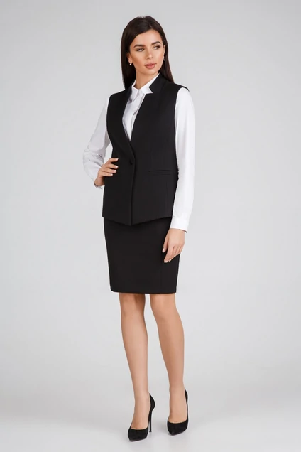 Элегантный деловой комплект-двойка. Однобортный жилет с застежкой на пуговицу. Воротник - невысокая стойка с треугольными вырезами. Жилет на подкладке. Спереди горизонтальные боковые карманы с листочкой. Средний шов спинки заканчивается шлицей.