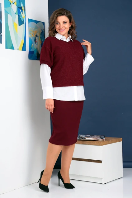 Компект женский 3-х предметный, юбка, жилет и рубашка. Жилет выполнен из трикотажа под мех "барашек" свободного силуэта. Горловина с V-образная. Оформлена бейкой из отделочного материала. По боковым швам выполнены разрезы. Рубашка прямая , воротник стояче-отложной на планку с петлями-пуговицами. Рукав втачной, по низу с притачной манжетой частично застегивающейся на пуговицы. Юбка прямого силуэта слегка заужена к низу на притачном поясе со сборкой на резинку. По низу задней половинки выполнена шлица.