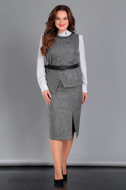 Комплект юбочный 3-х предметный. Жилет и юбка из костюмной ткани. По переду жилета нагрудные вытачки, по горловине довяз. Застежка – петли-пуговицы на спинке. Юбка на поясе, заужена к низу. По левой стороне шов с шлицей внизу. Рубашка из блузочной ткани, воротник стояче-отложной, застежка на петли-пуговицы. Рукава втачные, на манжетах. Декор – съемный ремень. Возможно применение иных элементов декора, не меняющих общий вид изделия. Длина жилета по спинке – 58 см. Длина юбки – 72 см. Длина рубашки по спинке – 65 см, длина рукава – 64 см.