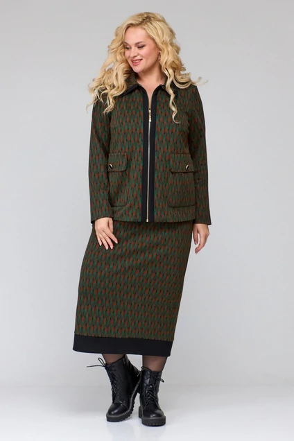 Комплект женский 2-х предметный юбочный из трикотажного полотна. Жакет прямого силуэта, воротник стояче-отложной, застежка центральная на тесьму-молнию. По переду обработаны накладные карманы с клапанами. Спинка неразрезная. Рукава втачные длинные. Юбка прямого силуэта, пояс на резинке. В боковых швах карманы. Задняя деталь со средним швом, с разрезом внизу. Низ юбки с планкой из отделочной ткани. Юбка на подкладке.