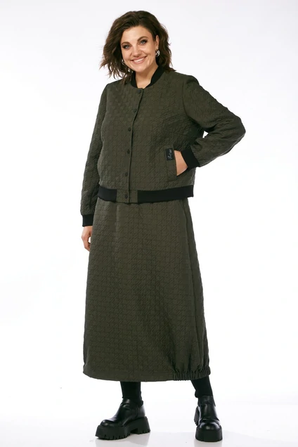 Костюм женский юбочный, изготовлен из ткани с эффектом стежки.Жакет прямого силуэта. По переду нагрудные вытачки,обработаны карманы с листочками. Застежка центральная бортовая на кнопках. Рукава втачные,длинные. По горловине, низу изделия и низу рукава вставлен довяз.Спинка цельнокроеная.Юбка на поясе с резинкой, обработаны боковые карманы. По низу юбки на участках сбоку вставлена резинка.
