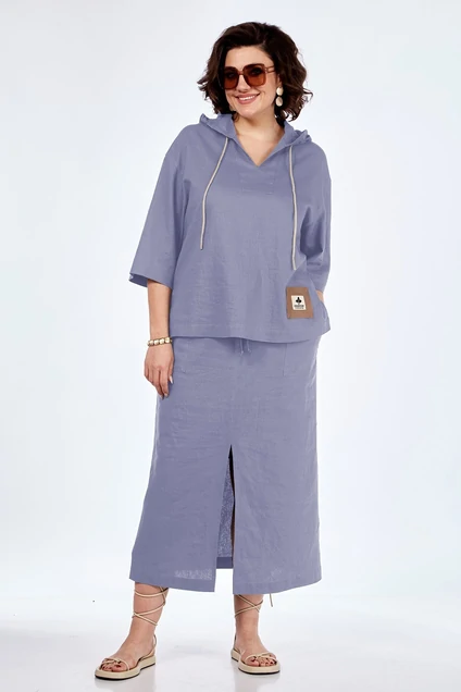 Костюм женский юбочный состоит из: Блузы и юбки. Выполнен из натуральной ткани. Блуза свободного кроя. Горловина V-образной формы, оформлена капюшоном с завязками. По переду фигурная вставка. Внизу декоративный элемент из искусственной кожи и нашивки. Рукав спущенный. Юбка прямого силуэта. Переднее полотнище со средним швом и разрезом внизу. В юбке обработан пояс на резинке. По переду накладные карманы с декоративной петлей.