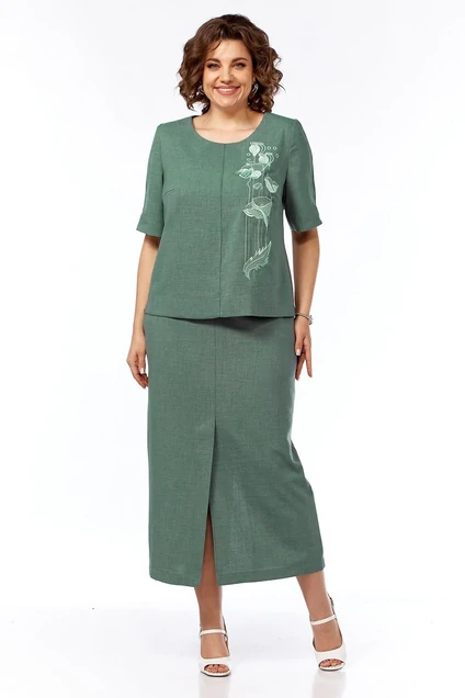 Костюм женский юбочный состоит из блузы и юбки. Изготовлен из плательной ткани. Блуза прямого силуэта. По переду средний шов, нагрудные вытачки. На детали полочки дизайнерская вышивка. Спинка с фигурным вырезом. Рукава втачные со средним швом. Юбка прямого силуэта, со средним швом и шлицей внизу. Пояс частично на резинке, обработаны боковые карманы. Юбка на подкладке.