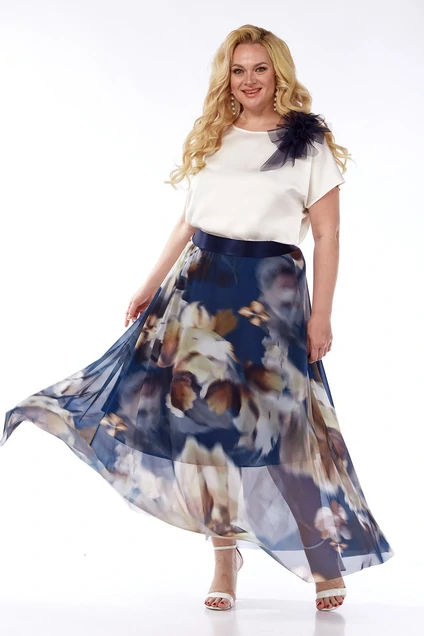 Комплект женский нарядный, состоит из блузки и юбки. Блузка свободного силуэта выполнена из блузочной ткани горловина формы лодочка. Перед и спинка цельные. Рукава цельнокроеные короткие. Низ на резинке. В качестве декора-цветок. Юбка А-силуэта выполнена из принтованной сетки. Пояс — притачная декоративная резинка. Юбка на подкладке.