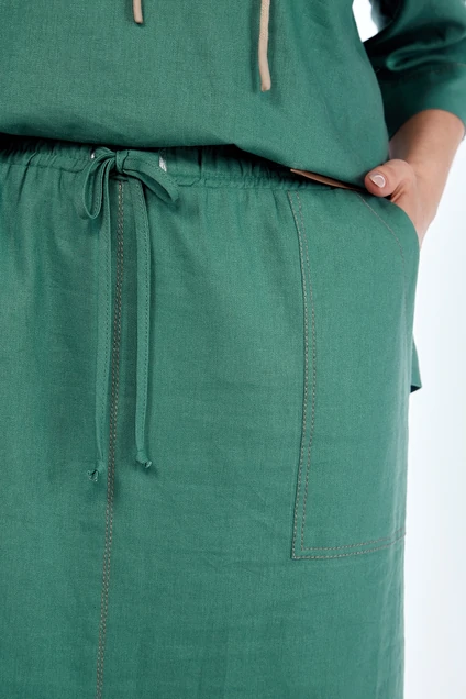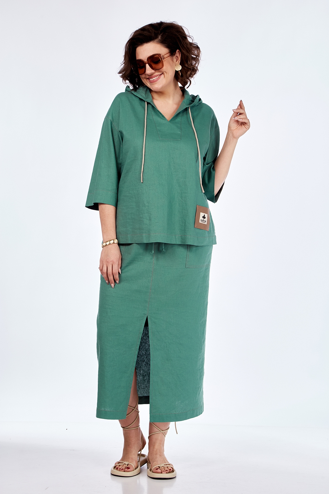 Костюм женский юбочный состоит из: Блузы и юбки. Выполнен из натуральной ткани. Блуза свободного кроя. Горловина V-образной формы, оформлена капюшоном с завязками. По переду фигурная вставка. Внизу декоративный элемент из искусственной кожи и нашивки. Рукав спущенный. Юбка прямого силуэта. Переднее полотнище со средним швом и разрезом внизу. В юбке обработан пояс на резинке. По переду накладные карманы с декоративной петлей.
