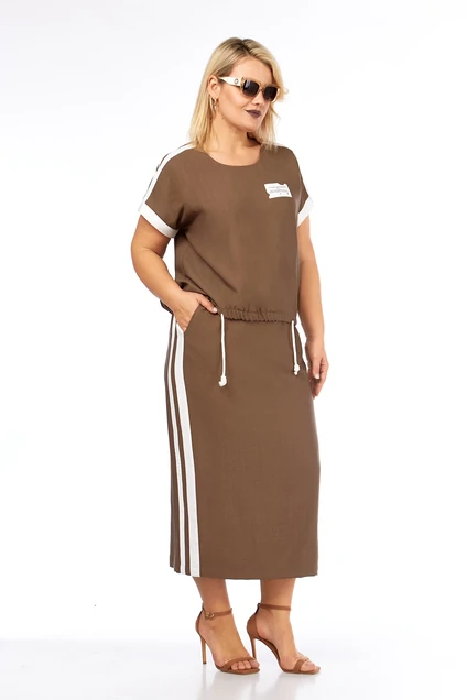 Костюм женский двухпредметный состоит из блузки и юбки, выполнен из вискозной ткани с эффектом мятости. Блузка свободного силуэта. Горловина округлой формы. Перед и спинка цельнокроеные. По плечевым обработаны вставки из отделочной ткани. Рукава короткие цельнокроеные, по низу притачная манжета из отделочной ткани. Низ блузки обработан кулисой с декоративным шнуром. Юбка прямого силуэта, пояс притачной на эластичной тесьме. По передним деталям юбки обработаны карманы с подрезным бочком. По задним деталям юбки имеется средний шов со шлицей. В боковых швах вставки из отделочной ткани. Юбка на подкладке.