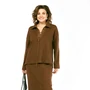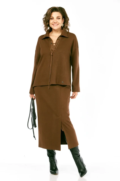 Костюм женский, юбочный, изготовлен из трикотажного полотна, состоит из джемпера и юбки. Джемпер свободного кроя. Горловина оформлена отложным воротником на стойке и планками, декорированными люверсами, с протянутым в них шнуром. Рукава спущенные, длинные. Низ изделия разной длины, в боковых швах разрезы. Кокетка спинки, планки и воротник джемпера выполнены из отделочной ткани. Юбка с цельнокроенным поясом на резинке. На передней части шов, внизу обработана шлица. Юбка на подкладке.