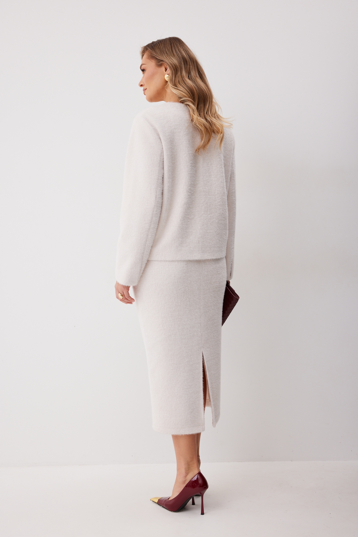 Юбка - карандаш из трикотажной тканина подкладке, длиной за колено. По переду юбки застрочены вытачки. По спинке юбки в среднем шве обработан разрез и застежка- «молния». Пояс юбки цельнокроеный с резинкой по переду.