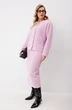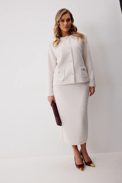 Костюм женский состоящий из жакета и юбки. Жакет женский из трикотажной ткани прямого силуэта на подкладке. На деталях переда настрочены накладные карманы округлой формы застегивающиеся на декоративные кнопки. Спинка прямая. Рукав двухшовный с имитацией шлицы. Горловина округлой формы. Жакет застегивается на декоративные кнопки.