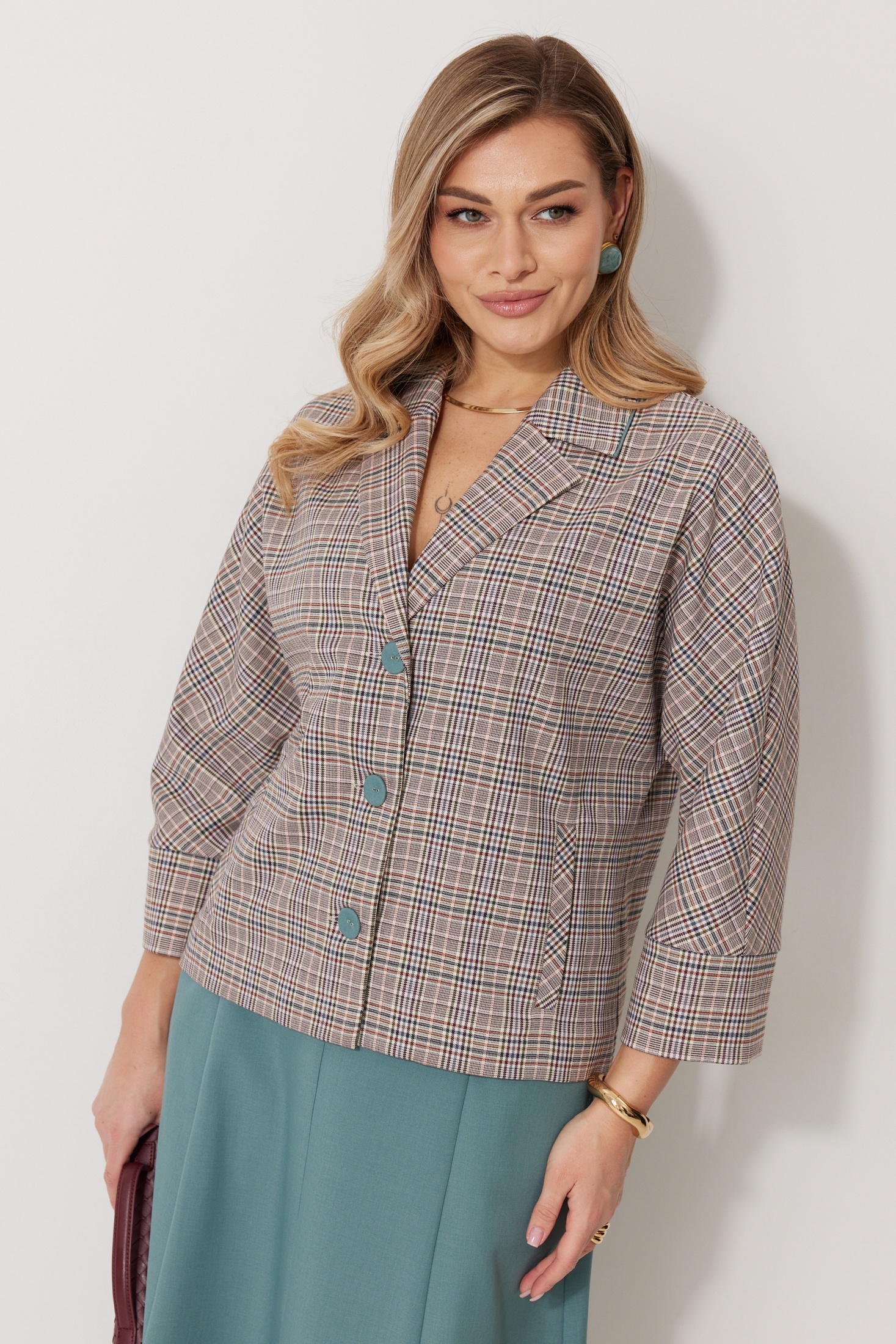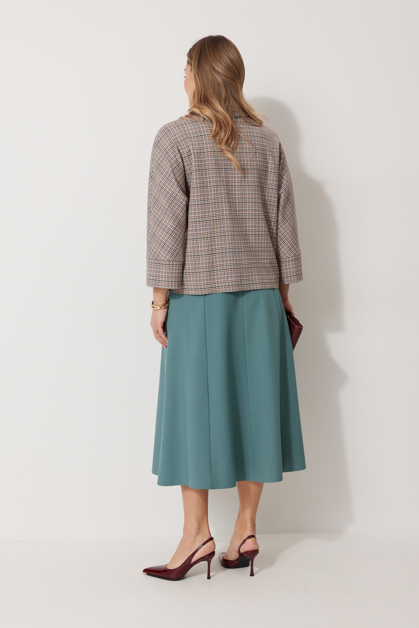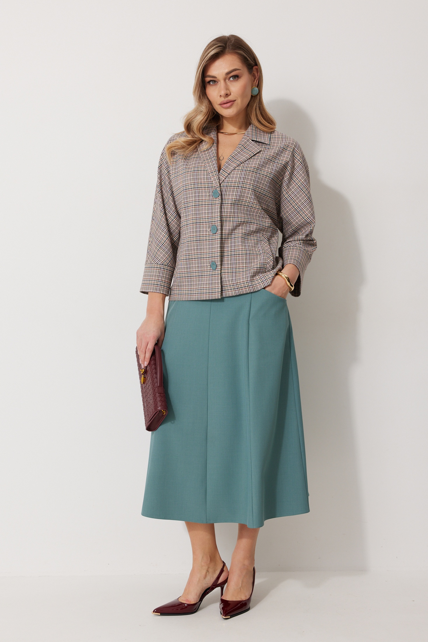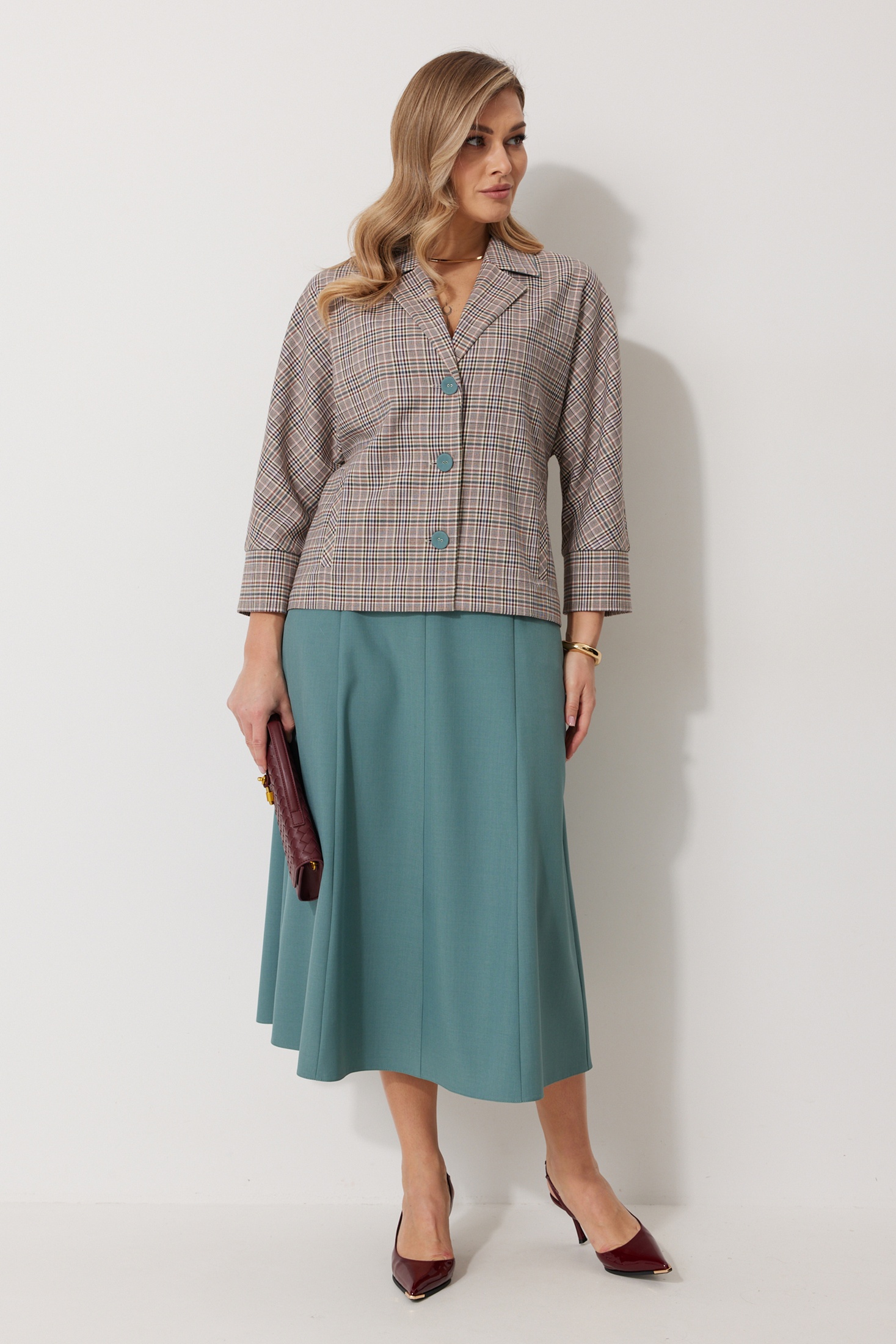 Костюм с юбкой 2266 Kaloris привнесёт свежий взгляд в ваш гардероб. Коллекция бренда Kaloris сочетает в себе комфорт и стиль. Костюм выполнен из ткани с составом 69% полиэстер, 27% вискоза и 4% спандекс, обеспечивая легкость и долговечность. Жакет кроя «летучая мышь» с V-образным вырезом и контрастными пуговицами подчеркивает изящество. Карманы с вертикальными прорезями добавляют функциональности. Рукав 7/8 и широкая манжета создают современный образ, длина рукава 66 см. Юбка А-силуэта средней длины с застежкой-молнией и карманом с отрезным бочком из 4 клиньев. Длина спинки жакета 60 см, юбки по боковому шву 82 см. Идеально для осени и весны, подходит для повседневного и офисного стиля. Цветовая палитра акцентирует вашу индивидуальность.