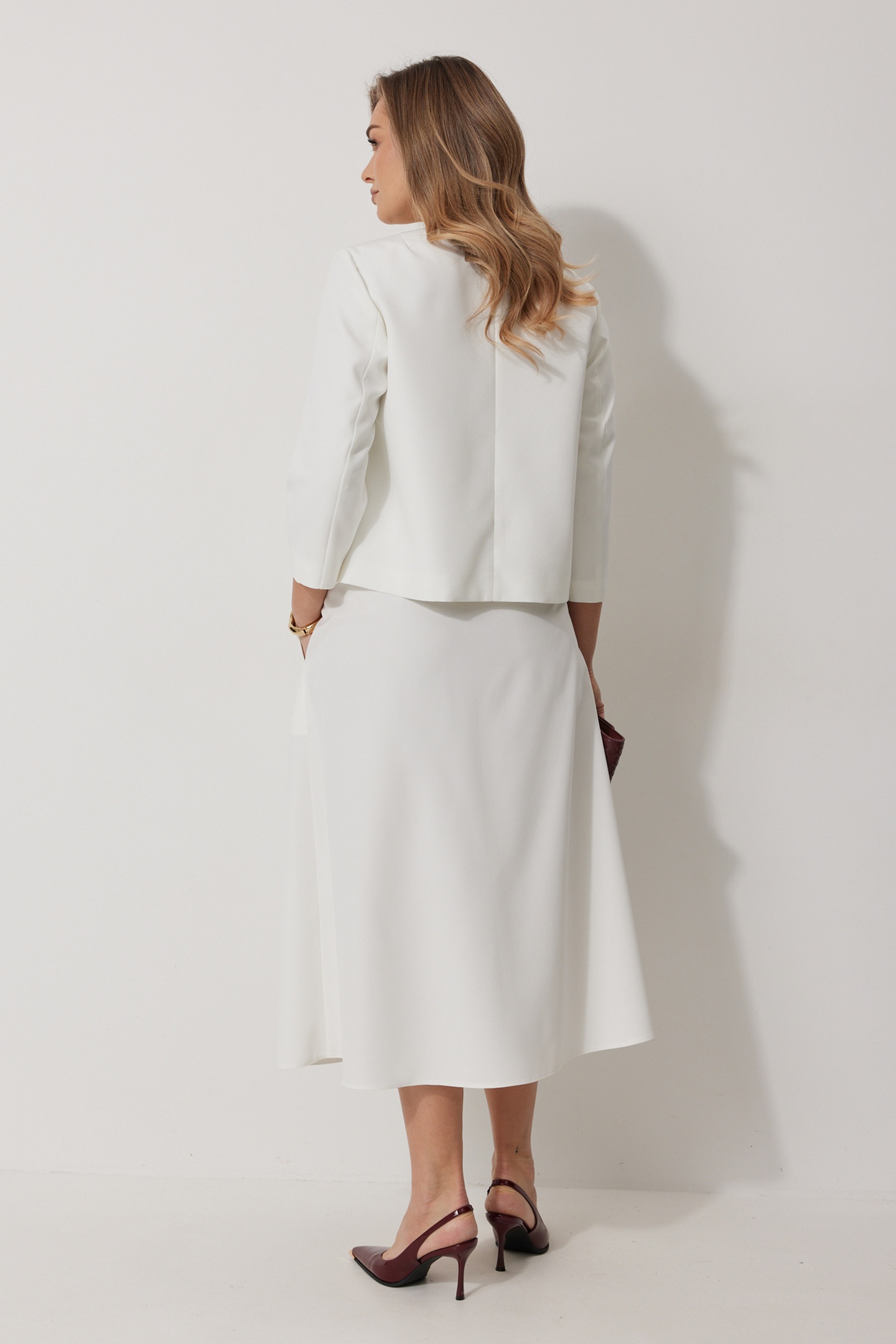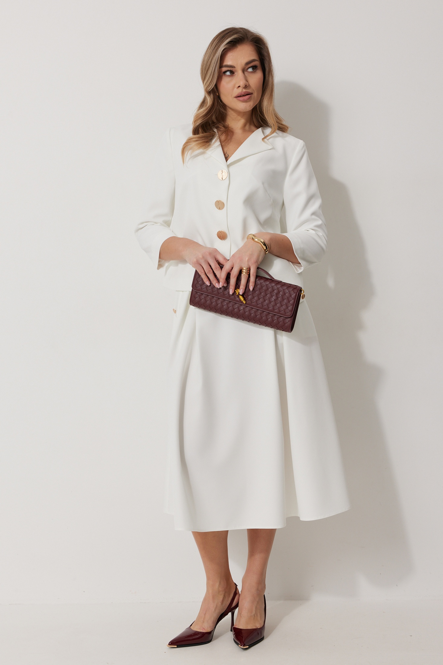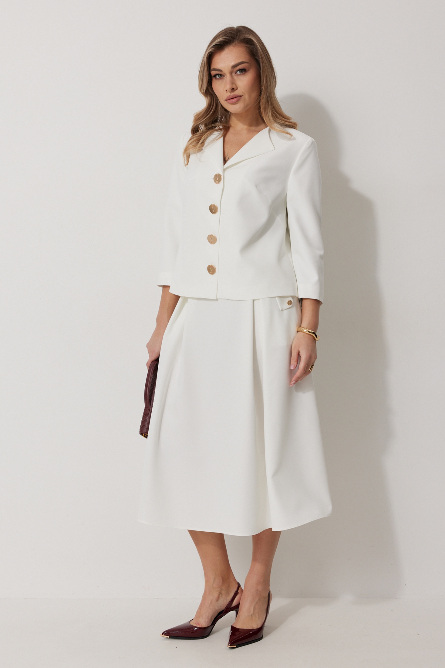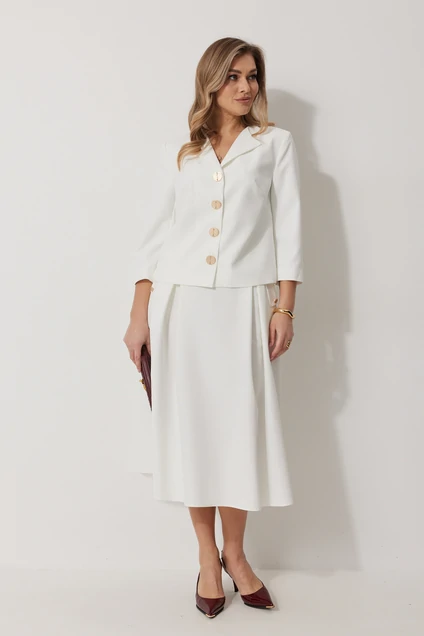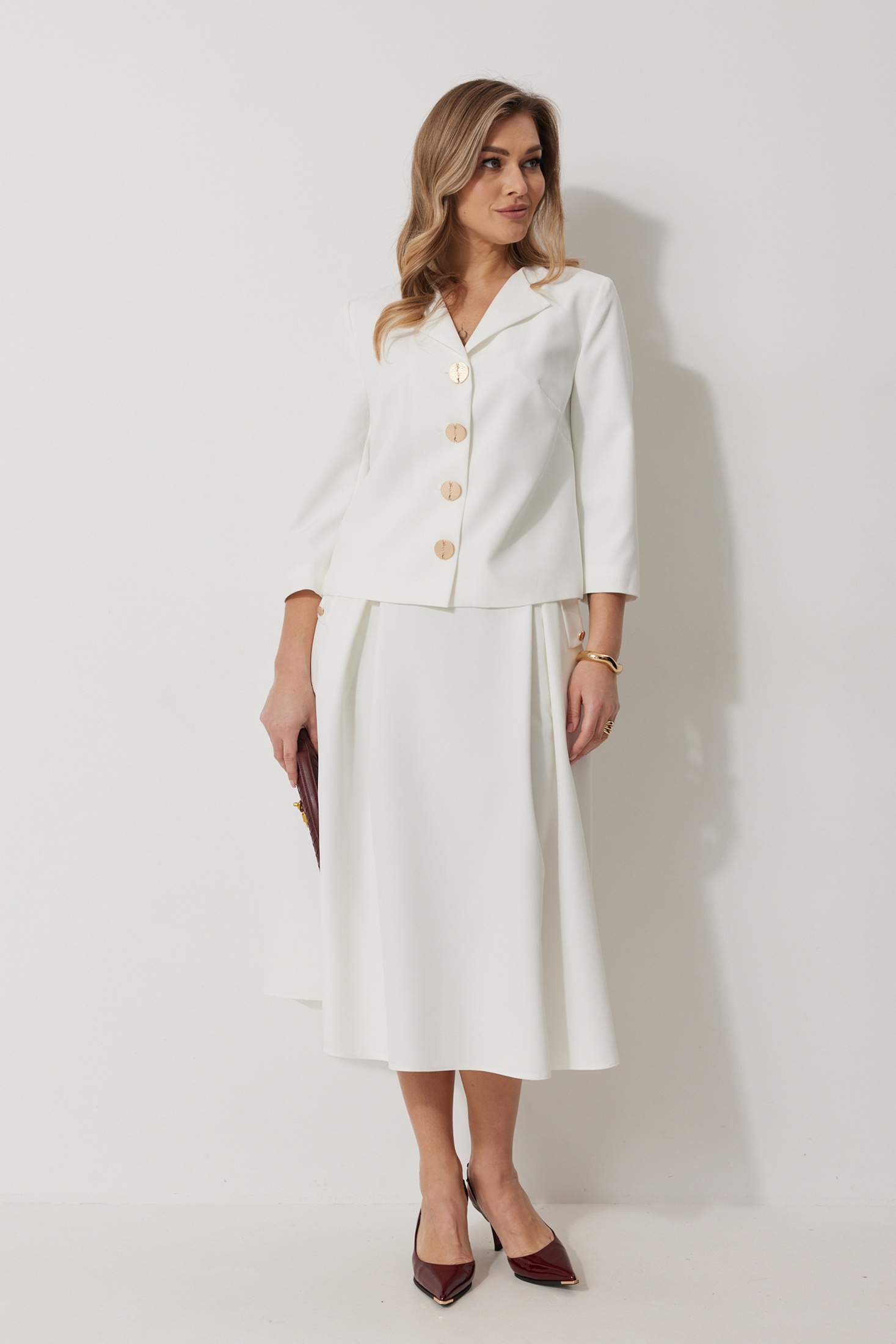 Костюм с юбкой 2283 Kaloris — это стильное решение для вашего гардероба. Коллекция бренда Kaloris сочетает в себе шик и элегантность, предлагая жакет и юбку, выполненные из полиэстера, вискозы и спандекса. Жакет на подкладке с V-образной горловиной и отворачивающимися лацканами подчеркивает изящность силуэта. Длина жакета до линии бедра, а длина рукава составляет 48 см. Юбка А-силуэта с длиной по боковому шву 78,5 см украшена встречными складками и декоративными пуговицами. Цвет изделия белый, что позволяет использовать костюм как для деловых встреч, так и для праздничных мероприятий в межсезонье. Застежка-молния и карманы в боковом шве добавляют практичности и удобства.