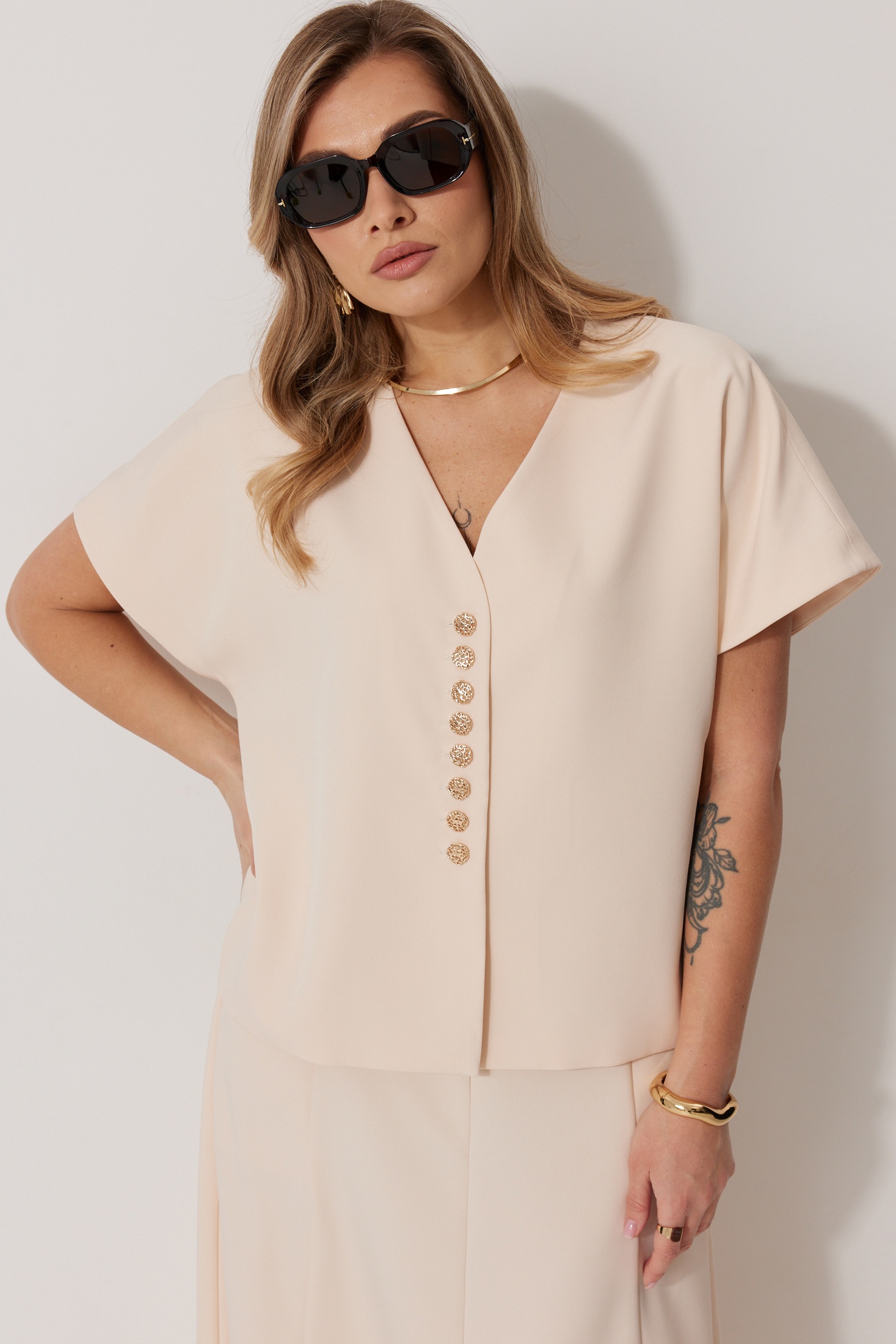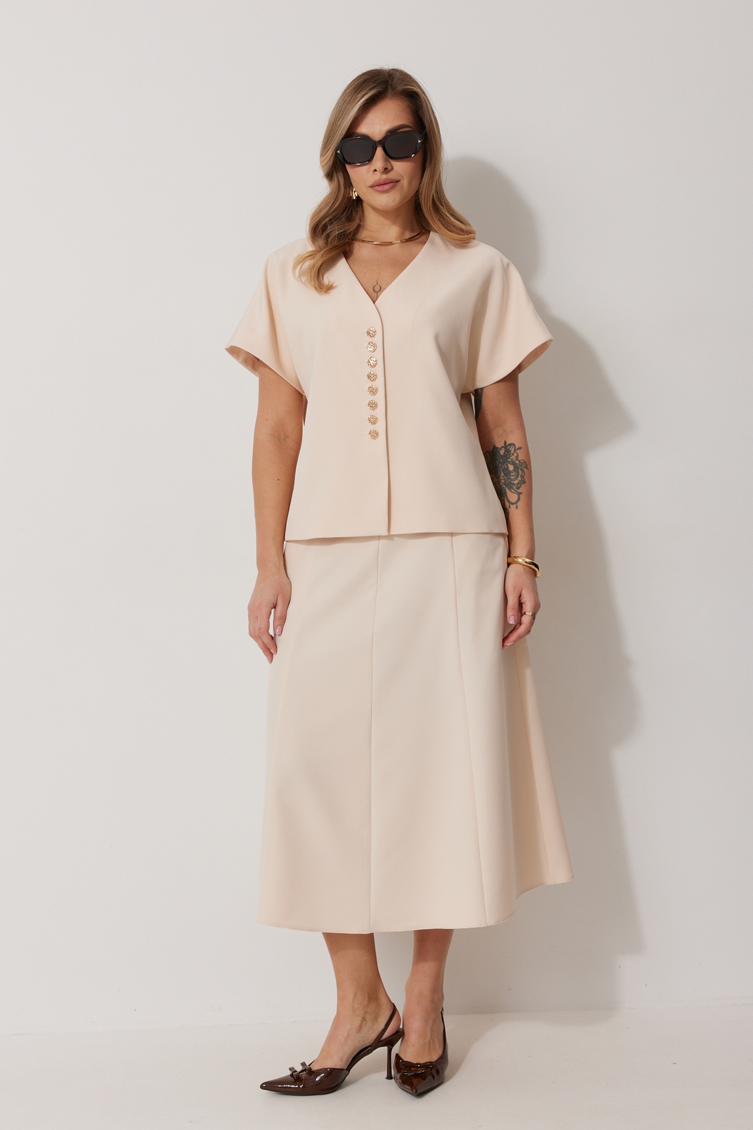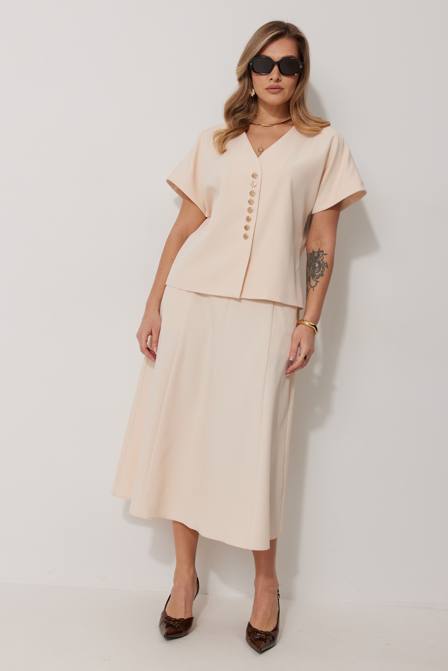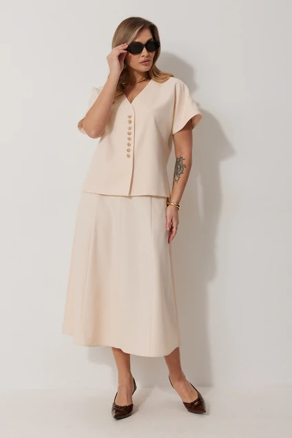 Костюм с юбкой 2290-1 Kaloris представлен в коллекции бренда с изысканным сочетанием жилета и юбки. Выполненный из полиэстера с добавлением вискозы и спандекса, он обеспечивает комфорт и лёгкость. Жилет прямого силуэта на подкладке с V-образной горловиной и декоративными пуговицами подчеркивает стильный образ. Юбка А-силуэта длиной до середины икры с центральной молнией на спинке и карманом дополняет классический дизайн. Этот костюм идеально подходит для теплого сезона и создан для праздничных мероприятий. Бежевый цвет придаёт модели свежесть и универсальность. Длина спинки жакета составляет 61 см, а длина юбки по боковому шву — 82 см.
