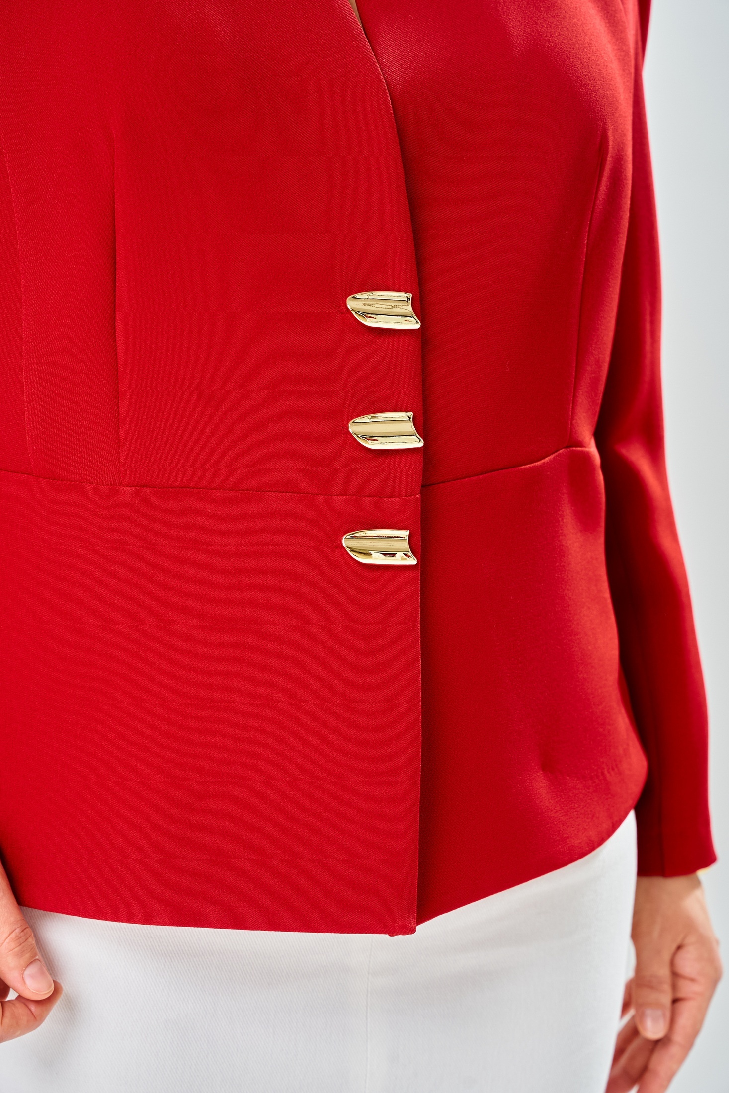 Костюм с юбкой 8060-1 красный + молоко KaVari plus size предлагает изысканный стиль и удобство для вашего гардероба. Коллекция бренда KaVari воплощает сочетание яркого красного жакета и молочной юбки. Жакет выполнен из полиэстера, вискозы и спандекса, обеспечивая комфорт и легкость. Структурированные плечи и баска добавляют изысканности, а длинные рукава с открытыми плечами делают дизайн более оригинальным. Застежка на пуговицы завершает образ, а юбка из хлопка с завышенной линией талии и карманами "хулиган" придает стильный вид. Благодаря длине жакета 61 см и юбки 91 см, костюм идеально подходит для деловых и деловых встреч в любое время года.