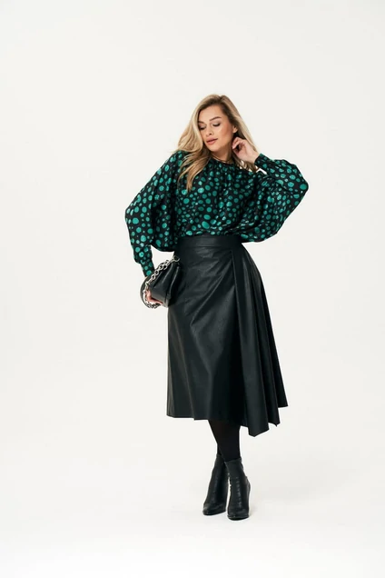 шелка. Вырез горловины круглый с небольшой сборкой по переду.По центру спинки планка с застежкой на мелкие пуговицы. Рукав цельнокроеный со сборкой понизу и манжетой с застежкой на пуговицы. Юбка удлиненная, из экокожи, на подкладке, с отрезным поясом-кокеткой и застежкой на потайную молнию в боковом шве. Нарядность модели придает необычное конструктивное решение юбки.