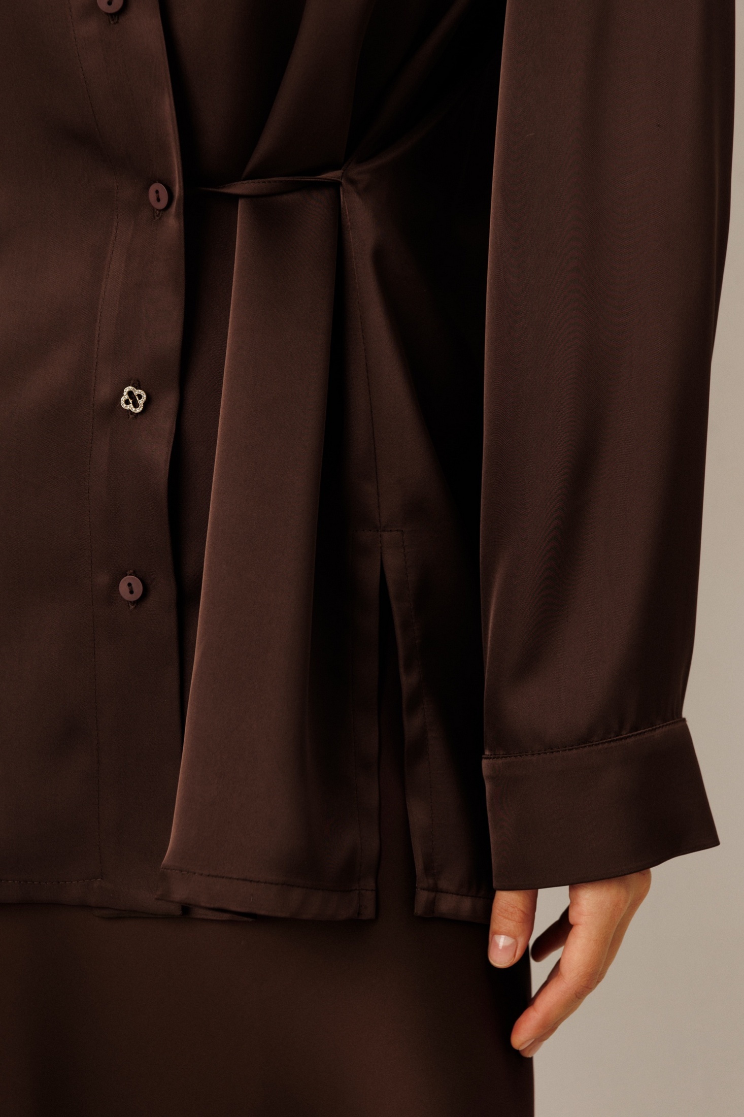– трансформер: можно носить приталенно, застегнув потайной ремешок, или создать расслабленный образ, завязав внутренние ленты и спустив на плечи.