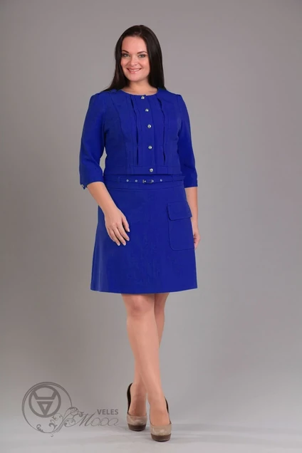 Костюм 2-х предметный, состоящий из жакета и юбки. Жакет полуприлегающего силуэта с круглым вырезом горловины. Перед с рельефами, выходящими из плечевого среза и центральной бортовой застежкой на петли и пуговицы. Параллельно застежке обработаны отрезные детали с закрепками. Спинка со средним швом и рельефами, выходящими от плечевого среза. Рукава втачные, двухшовные, длиной 3/4. В локтевых швах обработаны разрезы. По низу рукавов манжеты с застежкой на петли-пуговицы. По окату заложены складки. Юбка прямого силуэта, расклешенная к низу. Верх юбки обработан кокеткой. На кокетке шлевки т съемный поясок с металлической пряжкой и блочками. Переднее полотнище со средним швом и накладным фигурным карманом с клапаном на левой стороне. Вдоль среднего шва и по клапану проложены отделочные строчки. Заднее полотнище со средним швом. В шве потайная тесьма-"молния". Юбка на подкладке. Размеры 42-46: Длина жакета 42 см, длина рукава 44 см, длина юбки 50 см. Размеры 48-52: Длина жакета 43 см, длина рукава 44 см, длина юбки 53 см.