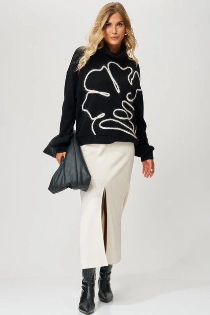 Джемпер женский, свободного силуэта, длиной ниже линии бедер, со спущенной проймой, с втачными рукавами, с втачным воротником-«шаль», с втачной планкой по низу. На детали переда нанесена аппликация-вышивка. Рукава втачные одношовные, с притачными манжетами. Вырез горловины округлой формы.