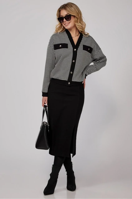 Костюм женский (джемпер и юбка). Джемпер женский из трикотажного полотна, свободного силуэта, длиной до линии бедер, со спущенной линией плеча, с втачными рукавами, понизу притачная планка, с застежкой на 4 петли и 4 пуговицы. Детали переда джемпера с притачными планками, переходящие по горловине спинки; вверху расположены широкие листочки с настрочными концами, на которых прикреплены декоративные пуговицы. Рукава втачные одношовные, с притачными манжетами. Юбка женская из трикотажного полотна, длиной ниже коленей, с втачным поясом, в который вставлена эластичная тесьма. Переднее полотнище с рельефным швом, который заканчивается разрезом. Деталь заднего полотнища с 2-мя вытачками. Джемпер: длина спинки – 56см. Юбка: длина середины спинки – 70см. Длина рукава и плеча - 70см, ширина низа рукава – 21см.