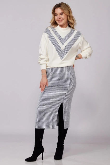 Костюм женский (джемпер и юбка). Джемпер женский, прямого силуэта, длиной до линии бедер, со спущенной проймой, с втачными рукавами, с втачной бейкой по горловине, с втачной планкой по низу. Рукава втачные одношовные, с притачными манжетами. Вырез горловины округлой формы. Юбка женская из трикотажного полотна, длиной ниже коленей, с цельнокроеным поясом, в который вставлена эластичная тесьма, в левом боковом шве обработан разрез. Переднее полотнище юбки с 2-мя вытачками. Джемпер: длина спинки – 57,5см. Юбка: длина середины спинки – 76см. Джемпер: длина рукава - 43см, ширина низа рукава – 40см.