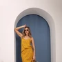 Элегантный комплект для женщин состоит из топа и юбки, выполненных в ярких тонах. Тонкая, желтая ткань украшена мелким черным принтом, придающим образу игривость и легкость. Топ со спагетти-бретелями и нежным падающим силуэтом обеспечивает комфорт и свободу движений. Стильная юбка достигает до колена, подчеркивая элегантность ансамбля. Данный комплект идеален для летнего гардероба, подходит как для прогулок, так и для особых случаев.
