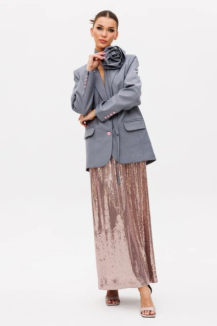 Стильный гармоничный комплект, состоящий из жакета и роскошной длинной юбки с мерцанием.
