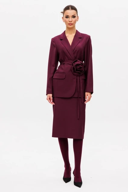 Стильный гармоничный комплект, состоящий из жакета, юбки и съемного текстильного пояса с цветком, который можно открепить.