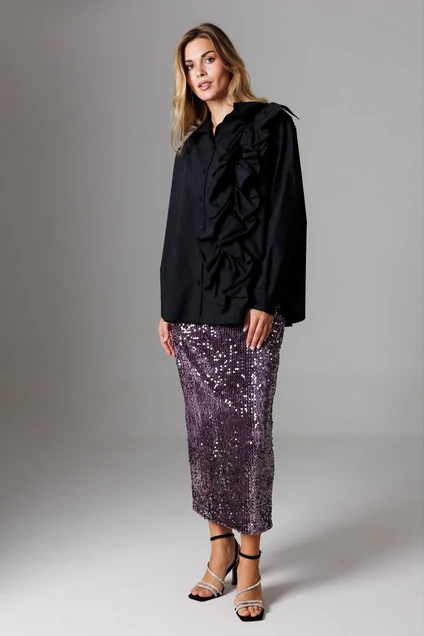 Блуза прямого свободного силуэта с рубашечным воротником на стойке и зауженным рукавом на манжете со спущенной линией плеча. Спереди на функциональной планке застежка петли/пуговицы. Декоративным акцентным элементом выступает ассиметричная рюша на сборке. Деталь расположена от плечевого шва вертикально к низу изделия. Спинка изделия имеет горизонтальную плечевую кокетку и встречную складку для свободы облегания. По плечевому шву заложена складка. Низ блузона слегка фигурный: спинка и полочка чуть длиннее бокового шва. Длина изделия блузона по спинке 73,5 см. Рукав рубашечный одношовный, завершается манжетой (высота 5 см) с застежкой петля/пуговица. Длина спущенного плечевого шва 33 см. Длина рукава с манжетой 41 см.