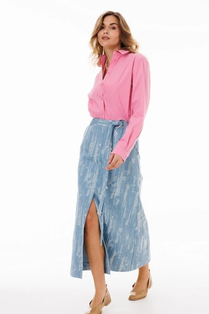 Стильный гармоничный комплект, состоящий из свободной блузы рубашечного покроя и юбки А-силуэта с разрезом спереди.