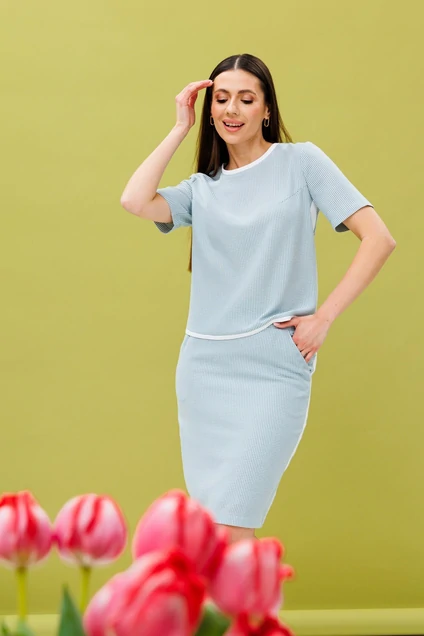 Стильный юбочный комплект, состоящий из блузона полуприлегающего силуэта. По переду блузона нагрудные вытачки, притачная планка из отделочной ткани, шириной 1,2 см. Потрясающе подчёркивает изящество фигуры боковая вставка из отделочной ткани, шириной 2,7см. Горловина переда блузона обработана притачной планкой из отделочной ткани, шириной 1,2 см. Спинка блузона с талевыми и вытачками, располагающимися в горловине. По среднему шву спинки: металлическая разъёмная тесьма-молния. Горловина спинки обработана обтачкой. Длина блузона по спинке: р.44-48: 53,5 см; для р.50-52: 54,5 см. Рукав втачной, одношовный, длиной 24 см. Юбка блузона на кокетке с боковыми, функциональными, наклонными карманами. С боковой вставкой из отделочной ткани, шириной 2,7 см. По среднему шву юбки потайная застёжка-молния, внизу разрез. Верхний край юбки обработан обтачкой. Юбка на подкладке. Длина юбки по боковому шву: для р.44-48: 59,5 см; для р.50-52: 62 см. Цвет комплекта может отличаться на полутон от заявленного на фото.