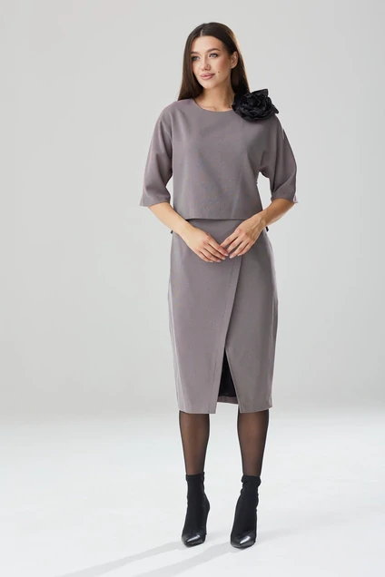 Элегантный и эффектный комплект юбочный премиум-класса , состоящий из юбки и блузона . Юбка прилегающего силуэта, зауженная к низу, по среднему шву потайная застёжка-молния, перед на запах. Верхний край юбки обработан притачным поясом. Юбка на подкладке. Длина юбки по боковому шву -73 см. Блузон прямого силуэта. В среднем шве спинки - потайная застёжка-молния. Длина по спинке 49 см. Горловина блузона обработана обтачкой. Рукав –’’летучая мышь’’ ¾-ой. Блузон украшен брошью-декором.