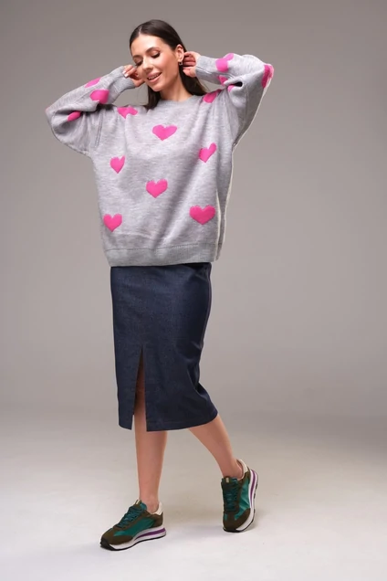 Свитер с фактурным принтом в виде декоративных сердец прямого силуэта, спущенной линией плеча и округлой горловиной. Длина свитера 65 см, длина рукава вместе с линией плеча от горловины 80 см.
