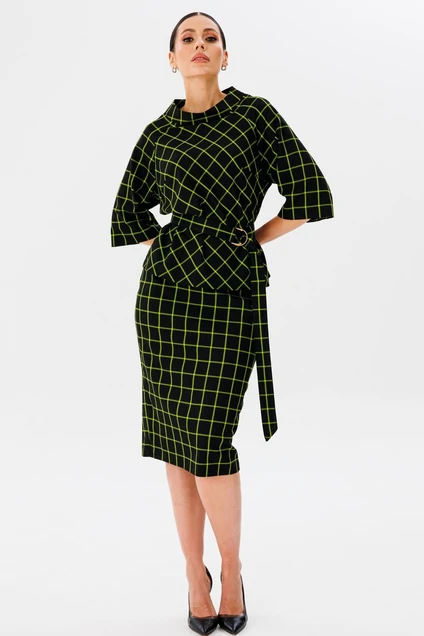 Блузон прилегающего силуэта с разрезами по боковым швам (по 7 см). На передней части изделия горизонтальные вытачки. В среднем шве спинки потайная застежка молния. Горловина обработана стойкой-воронкой высотой 4,5 см. Длина блузона по спинке от стойки 54 см. Рукав-реглан чуть расклешен к низу. Длина рукава от горловины-стойки 46 см. Юбка на подкладке прямого силуэта, чуть зауженная к низу. В среднем шве размещена потайная молния и открытый разрез. На линии талии размещены классические вытачки. Пояс внутренний, обтачной. Длина юбки по боковому шву 70 см. Высота разреза 21 см. Комплект дополнен съемным текстильным поясом на пряжке.