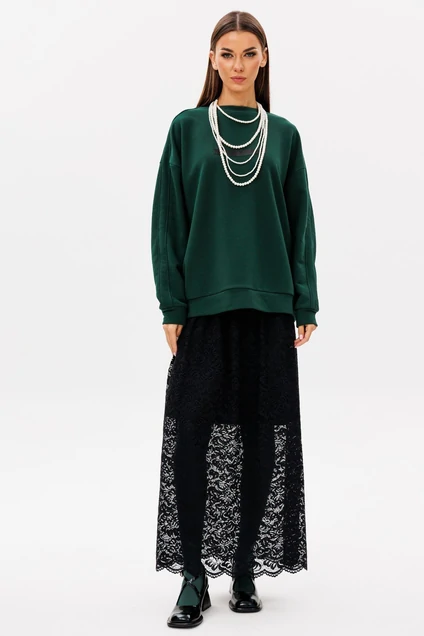 Свитшот прямого свободного силуэта оверсайз со спущенной линией плеча. Рукав трехшовный, оканчивается манжетой шириной 5,5 см. По центру линии плеча рукава вставлены лампасы из основного трикотажного полотна шириной 4 см. Горловина имеет округлый вырез обработана планкой по косой, шириной 3 см. Низ изделия обработан планкой-манжетой, высотой 6,5 см. На фронтальной части переда расположен декоративный элемент-нашивка вытянутой прямоугольной формы в тон юбки комплекта. Длина изделия свитшота по центральной линии спинки 70-72 см, в зависимости от размерного ряда.