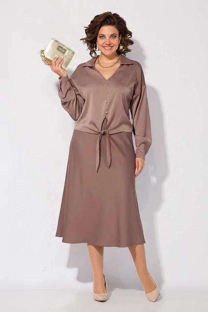 Шикарный женский юбочный костюм, выполнен из струящейся ткани с атласным эффектом, идеален для торжественных мероприятий, а также подойдёт для работы в офисе. Блузка свободного силуэта, со спущенной линией плеча и длинным рукавом. Низ рукава оформлен притачной манжетой с застёжкой на пуговицу. Воротник отложной, рубашечного типа, переходящий в V-образный вырез горловины. По полочке имитация застежки, переходящий в декоративную завязку. Спинка прямая, без особенностей. Юбка в модели французской длины, скроена по-косой для более комфортного прилегания. Юбка на трикотажной подкладке с резинкой в поясе по кругу. Длина блузки – 60 см, рукав – 63 см. Длина юбки – 80 см.