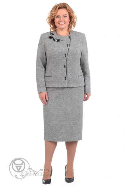 Повседневный трикотажный 2-х предметный костюм, состоящий из жакета и юбки. Жакет без подкладки. Юбка на подкладке. Жакет полуприлегающего силуэта, перед с фигурными рельефами из проймы, в которых обработаны листочки. Вверху справа расположена аппликация, горловина круглой формы, застёжка бортовая ассиметричная на 5 петель и пуговиц. Спинка со средним швом и рельефами от проймы до низа. Рукав втачной длинный 2-х шовный. Горловина, край борта и листочки с окантовкой. Юбка среднего объема. Заднее полотнище юбки с талиевыми вытачками и средним швом, в котором обработана застежка-молния и шлица. Юбка на поясе с резинкой по боковым швам. ЖАКЕТ: длина спинки-57,5см., длина рукава-61,5см, ПОГ:56р-59,5см, 58р-61,5см, 60р-63,5см. ПОБ:56р-62,5см, 58р-64,5см, 60р-66,5см. ЮБКА: длина-72,5см. ПОТ:56р-44,5см, 58р-46,5см, 60р-48,5см. ПОБ:56р-62,5см, 58р-64,5см, 60р-66,5см.