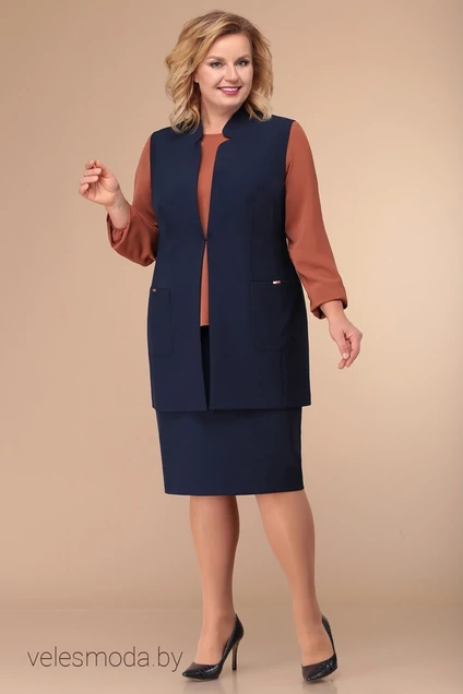 Состав ткани: Ткань текстильная (юбка, жилет) -- 96% полиэстер, 4% спандекс Ткань текстильная (блузка) -- 100% полиэстер Описание: Повседневный текстильный 3-х предметный комплект, состоящий из жилета, блузки и юбки (на подкладке). Жилет удлинённый с цельнокроеной стойкой и фигурным вырезом. Спереди нагрудные вытачки и накладные карманы, по спинке средний шов и рельефы из проймы. Блузка полуприлегающего силуэта с нагрудными вытачками из проймы. Вырез горловины круглый. Рукав длинный, собранный внизу на резинку. Юбка зауженная к низу, на поясе по бокам вставлена резинка от вытачек, застежка на молнию и пуговицу, в среднем шве обработана шлица.