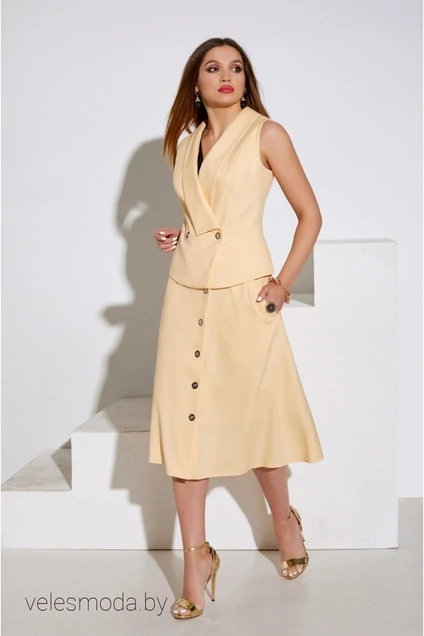 Жилет со стояче – отложным воротником, притачной баской и двубортной застёжкой на петли и пуговицы. Спинка со средним швом и двумя рельефами до баски. Жилет на подкладке. Блуза с фигурным вырезом горловины.