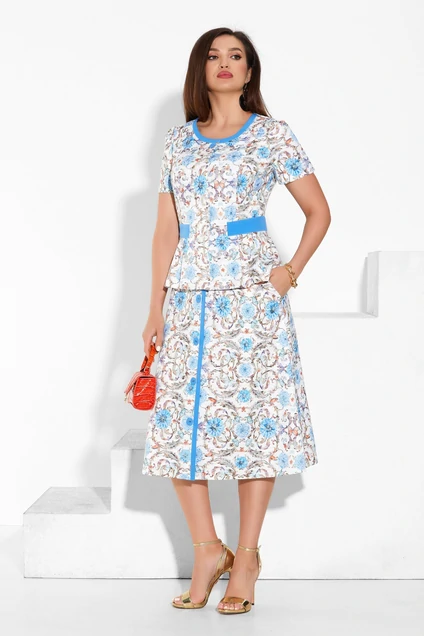 Жакет с округлым вырезом горловины и центральной застёжкой на петлю и пуговицу и потайные пуговицы. На уровне талии отрезная деталь из отделочной ткани и складками от неё. Спинка со средним швом и двумя рельефами до талии. Рукава втачные со складками. Юбка на притачном поясе, с центральной застёжкой на петли и пуговицы. Переднее полотнище с наклонными карманами к боковым швам. Юбка на подкладке.
