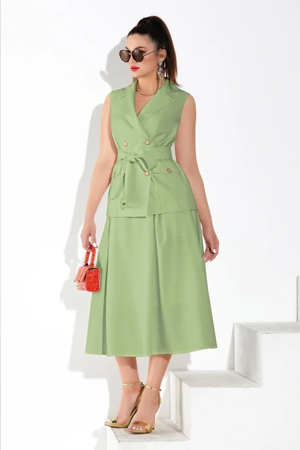 Жилет с воротником пиджачного типа и двубортной застёжкой на петли и пуговицы. На уровне талии съёмный пояс. Перед с накладными карманами с клапанами в нижней части. Спинка с кокеткой, переходящей на перед изделия, и средним швом. Изделие на подкладке. Юбка на поясе и карманами в боковых швах. Переднее и заднее полотнище со складками. Заднее полотнище с потайной молнией в среднем шве. Юбка на подкладке.