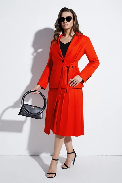 Жакет со стояче-отложным воротником пиджачного типа и центральной застёжкой на петлю и пуговицу. Перед с карманами с листочками в нижней части и завязкой по талии от борта до рельефа. Спинка со средним швом и двумя рельефами. Рукава втачные со шлицами и пуговицами по низу. Изделие на подкладке.
