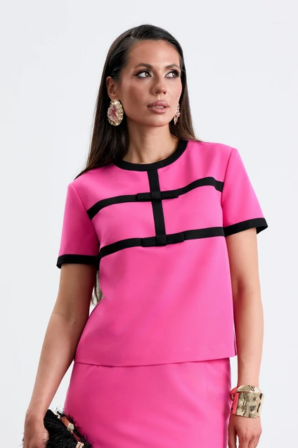 Блуза с округлым вырезом горловины. Перед с декоративными отрезными деталями и бантами контрастного цвета. Спинка с потайной молнией в среднем шве. Рукава втачные с контрастной отделочной деталью по низу.
