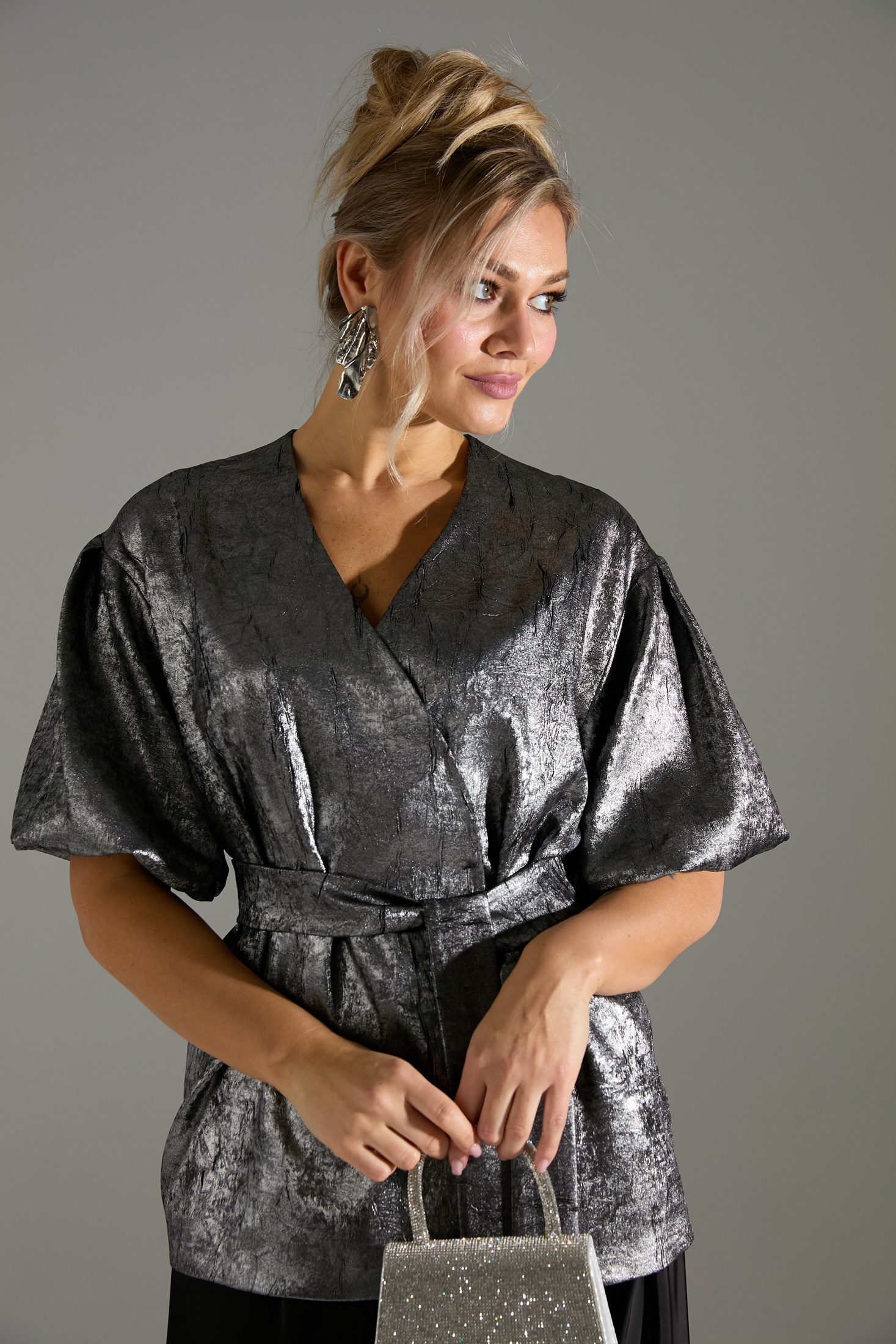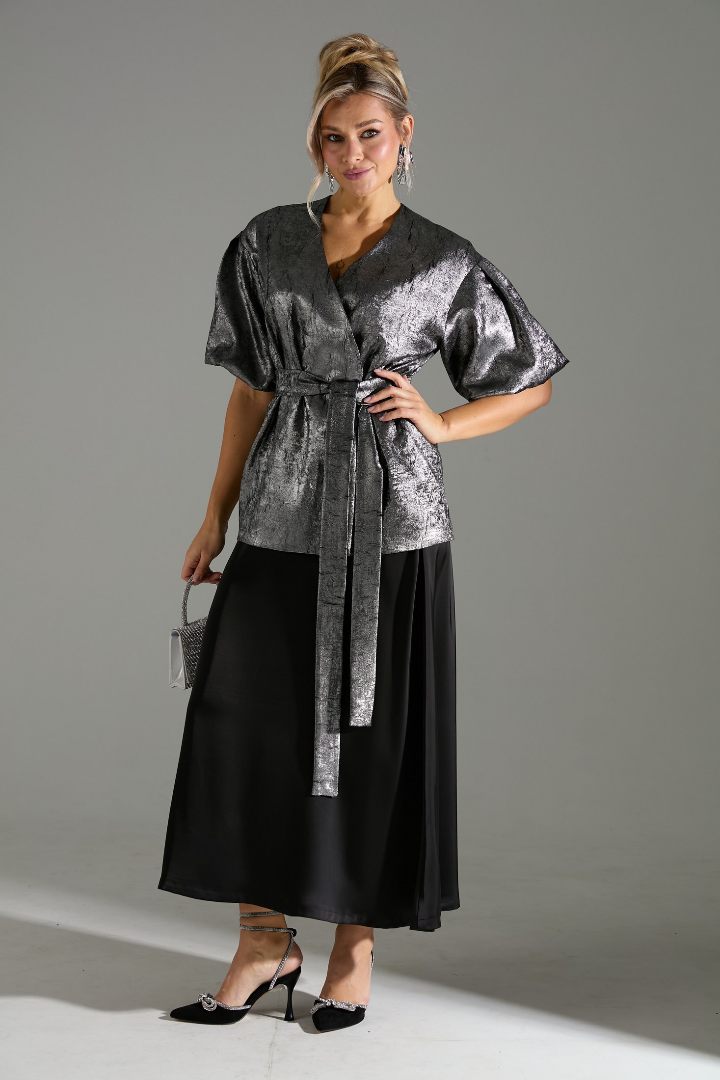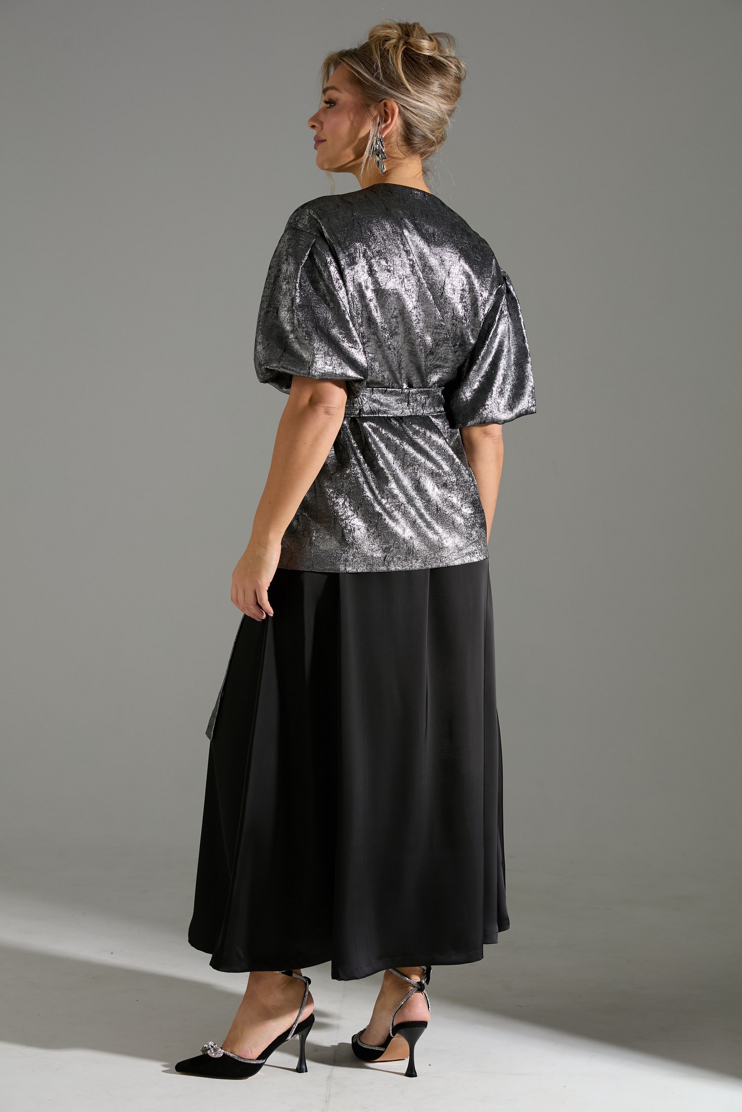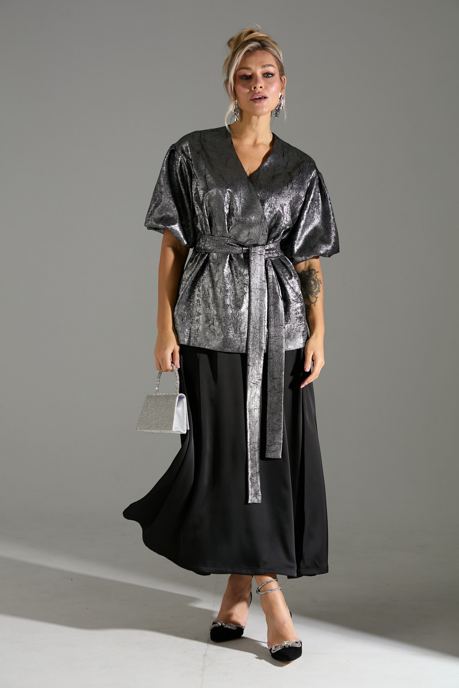 Элегантный женский костюм состоит из жакета и юбки. Жакет выполнен в серебристом цвете с мягким металлическим блеском, дополнен объёмными рукавами, создающими современный силуэт. Модель жакета на запах с практичной застёжкой на кнопки спереди и акцентированным тканевым поясом на талии украшен изящным бантом, подчёркивающим фигуру. Длина жакета варьируется от 72 до 78 см, что идеально сочетается с макси-юбкой. Юбка выполнена в классическом чёрном цвете, которая контрастирует с жакетом, создавая изысканный образ. Стиль трапеция делает её визуально легкой и воздушной, идеально подходя для официальных мероприятий и вечерних выходов. Этот комплект отлично подойдёт для тех, кто ценит утончённость и комфорт в одежде.