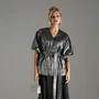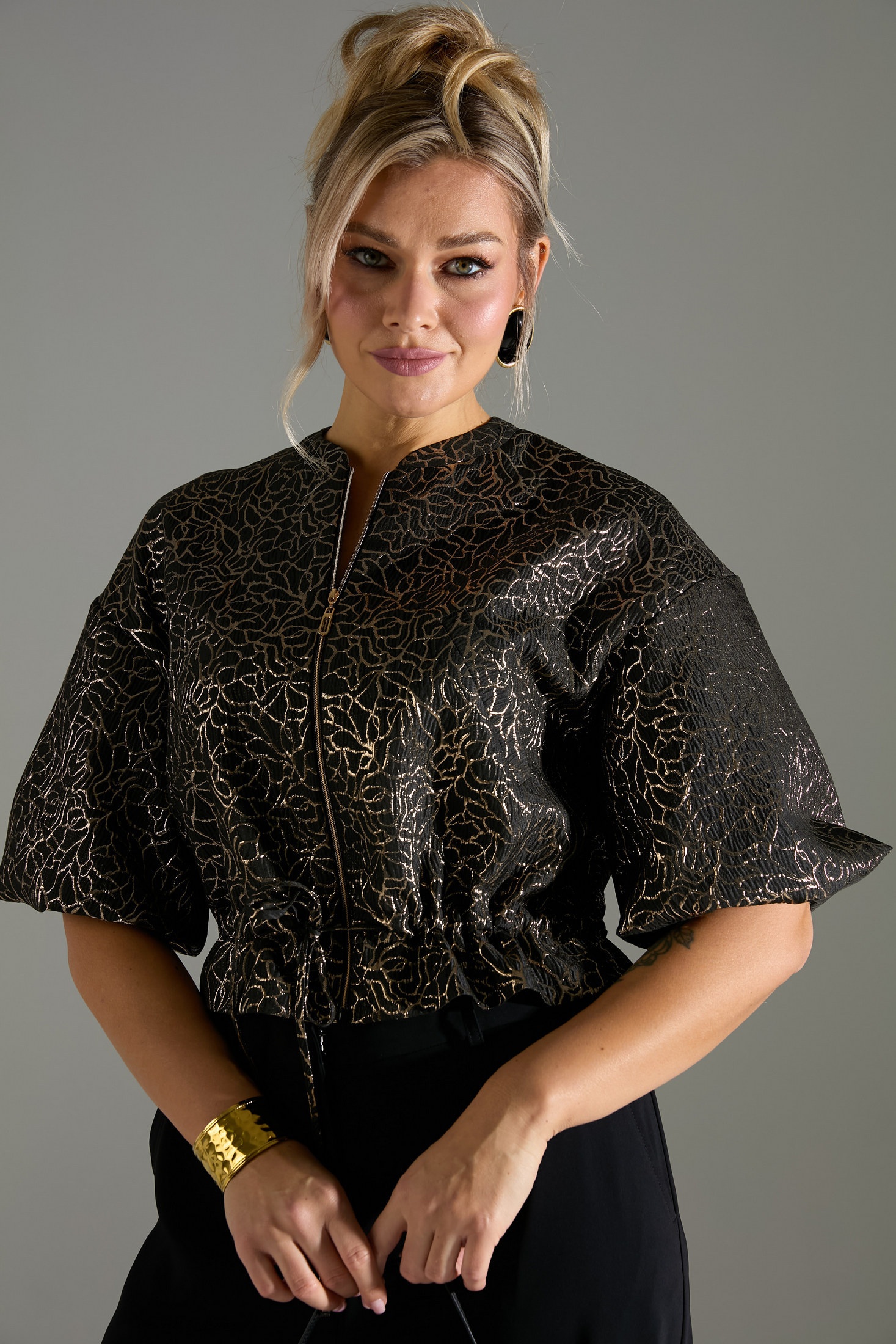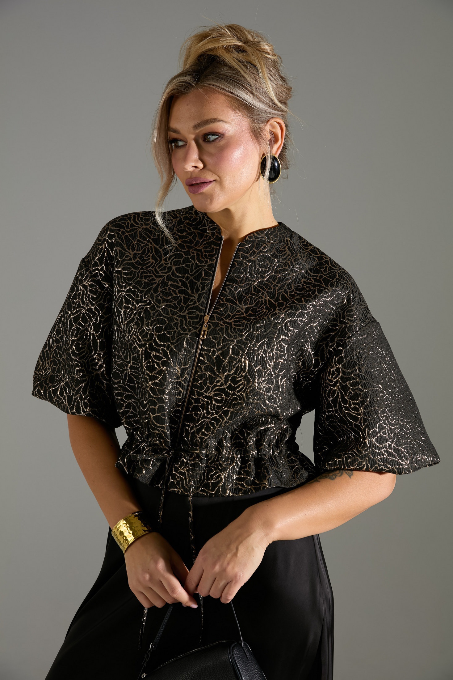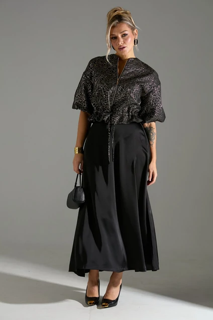 Элегантный женский костюм, включающий в себя жакет и длинную юбку, идеально подходит для создания стильного образа. Жакет выполнен из ткани с блестящим абстрактным принтом в бронзовых и серебристых оттенках. Особенностью дизайна является застежка на фронтальной молнии, которая добавляет современный акцент. Объемные рукава придают образу легкость и воздушность, а линия талии на кулисе с завязками из основной ткани подчеркивает силуэт. Юбка трапециевидного кроя выполнена из гладкой черной ткани и оформлена в макси длину, что придает ей особую элегантность. Этот костюм станет прекрасным выбором для деловых встреч или вечерних мероприятий.