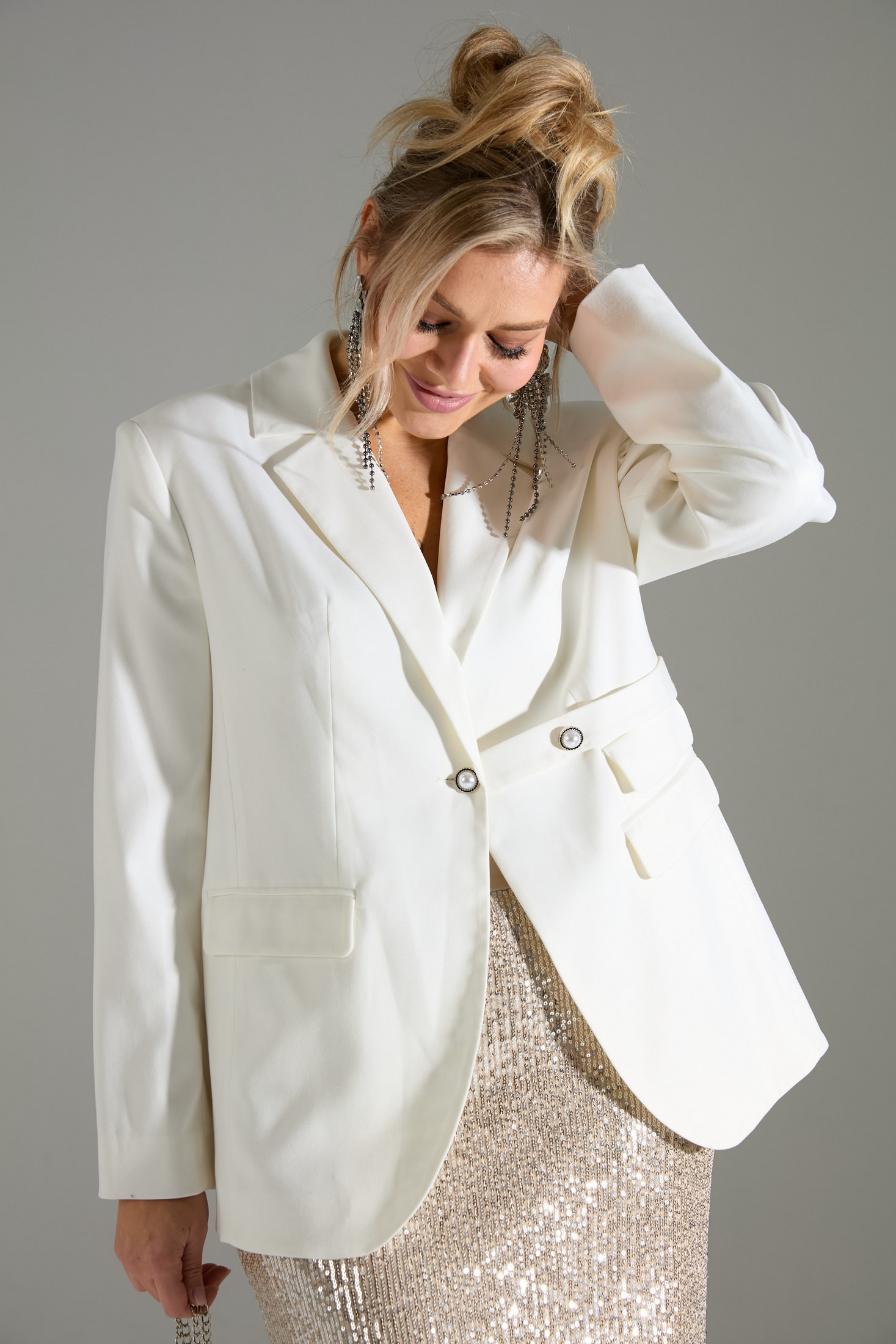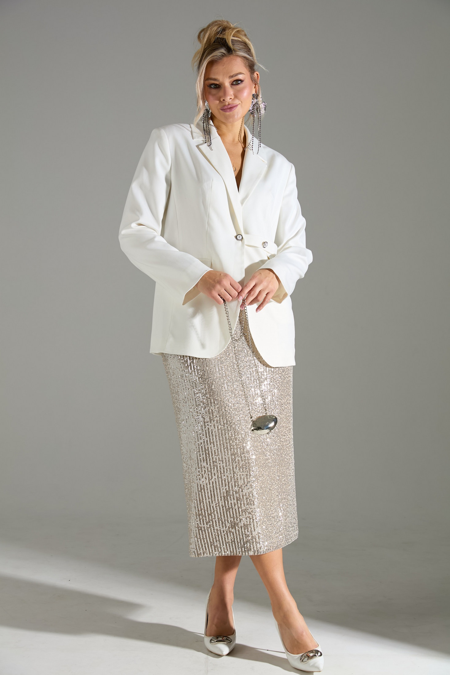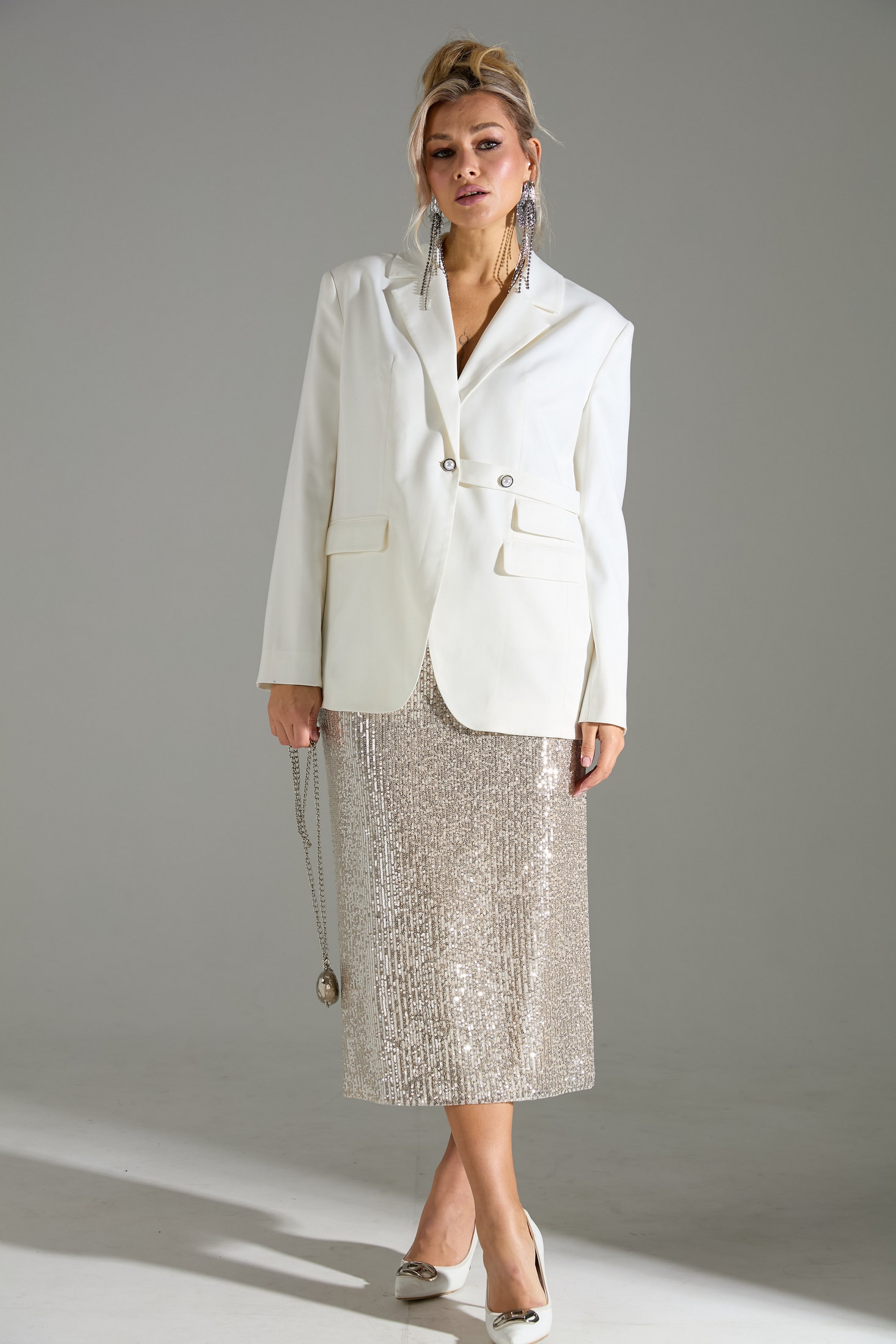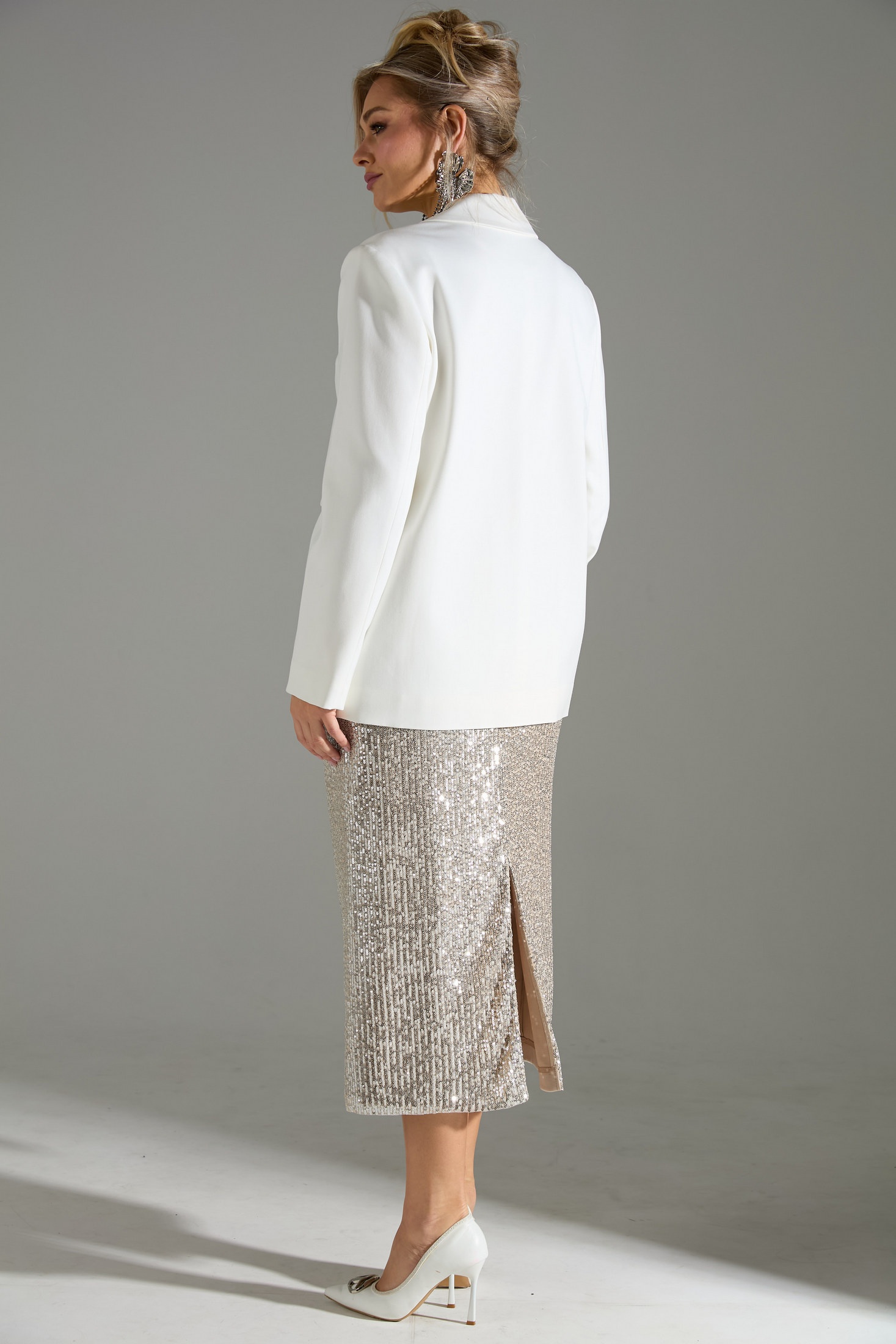 Комплект 2-ка, состоящий из жакета и юбки. Жакет однобортный объёмного силуэта с расширенным плечевым поясом. Застёжка на одну пуговицу. Из бокового шва выходит декоративная пата. По полочки распложены три прорезных кармана с клапанами, два из которых функциональные. Юбка- карандаш длиной ниже колена прямого силуэта. Пояс юбки и подкладка выполнены из эластичного трикотажа. Верхний слой юбки из лёгкой ткани расшитой пайетками. Застёжка на потайную молнию в среднем шве по спинке, разрез расположен внизу среднего шва.