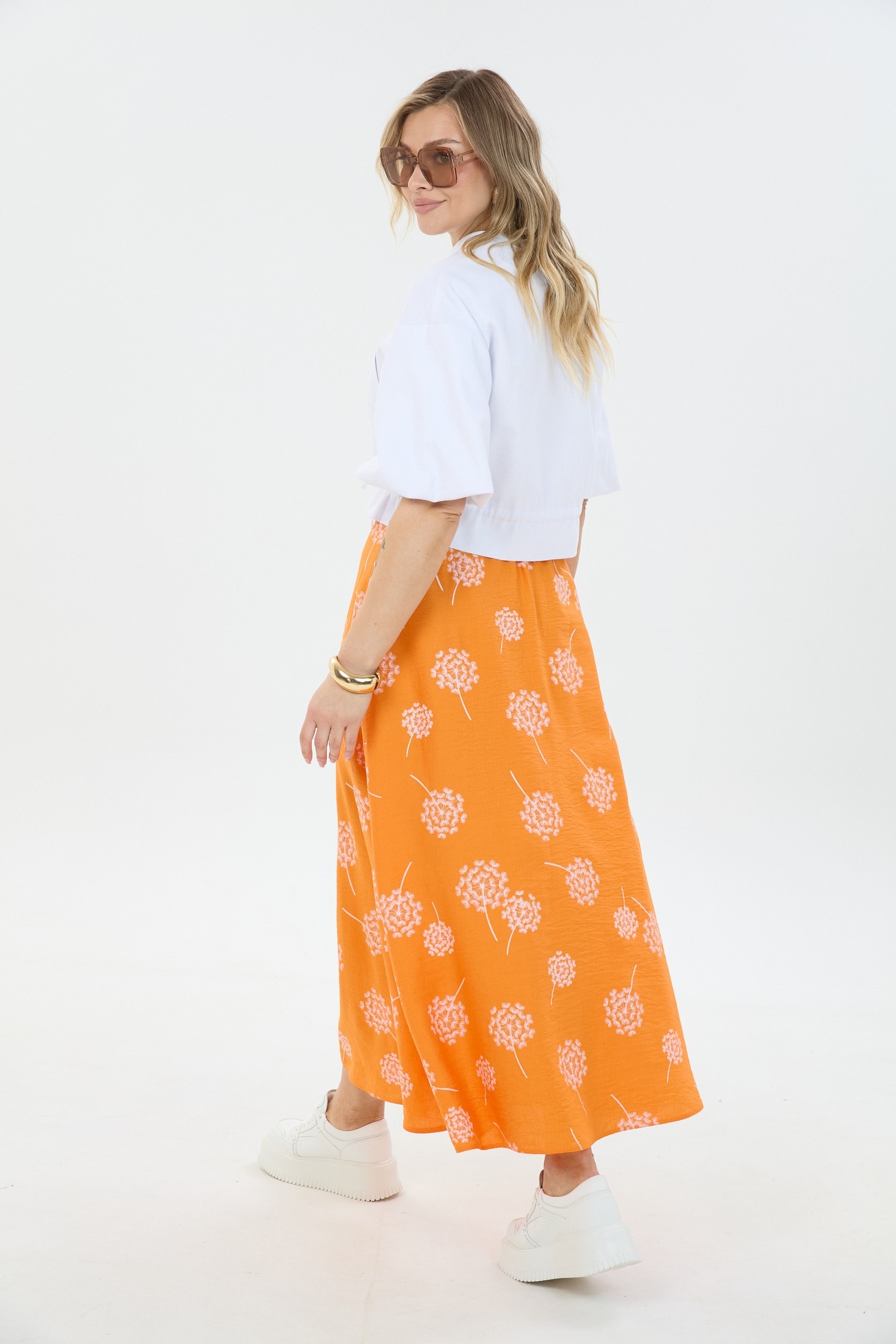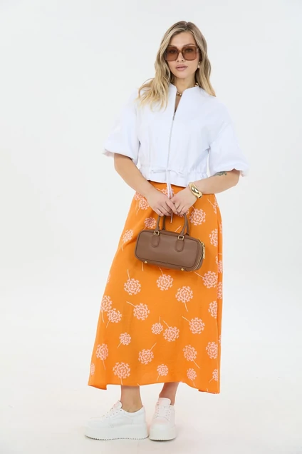 Костюм с юбкой К1340114 LM от Лаборатории моды привлекает внимание своим элегантным дизайном. Коллекция бренда включает бомбер из 100% хлопка, который застёгивается на молнию и имеет объёмные рукава. Линия талии подчеркивается завязкой из основной ткани. Трапециевидная юбка длиной макси выполнена из 45% вискозы и 55% полиэстера, с удобной резинкой сзади пояса, потайной молнией и пуговицей сбоку. Приятный на ощупь материал обеспечивает комфорт. Этот комплект идеально подходит для повседневного стиля, особенно в тёплое лето, благодаря свежему цветочному принту и яркому оранжевому оттенку.